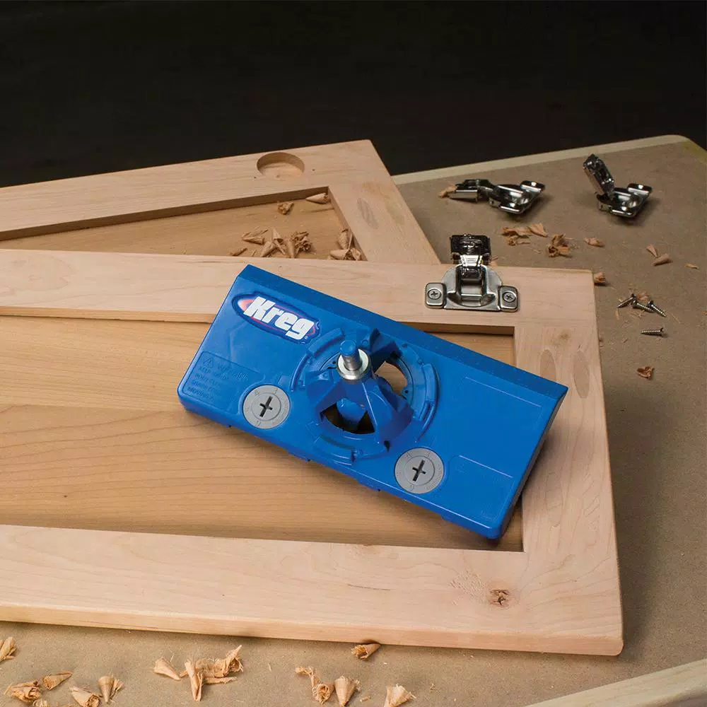 The Concealed Hinge Jig takes the guesswork out of installing cabinet doors using concealed hinges. The Concealed Hinge Jig allows you to drill cup holes for concealed cabinet door hinges (sometimes called Euro hinges) using just a drill. The jig positions an included carbide-tipped bit exactly at the proper position and offset and drills to the perfect depth every time thanks to adept stop collar. The Kreg Concealed Hinge Jig takes the guesswork out of drilling those holes and allows you to do it with nothing more than a drill and the carbide-tipped bit that comes with the jig. Note: A 1/16 in. bit is required to drill for hinge-mounting screws. Not included. The Concealed Hinge Jig consists of a glass-filled nylon base with a hole that receives a drill guide. Indexing cams ensure that the jig positions the bit to drill a hole at the required offset which is dictated by each hinge and a built-in stop collar ensures that the cup depth is correct every time. There are even holes that you can use to guide a bit for hinge screw holes. The Concealed Hinge Jig comes with a high-quality, carbide tipped bit to ensure great results. Just pick out your hinges, look up a few basic mounting instructions that come with them and then set up the Concealed Hinge Jig by adjusting a pair of built-in cams. After that, you are set to drill hinge cup holes using any ordinary drill.