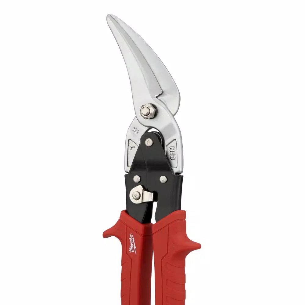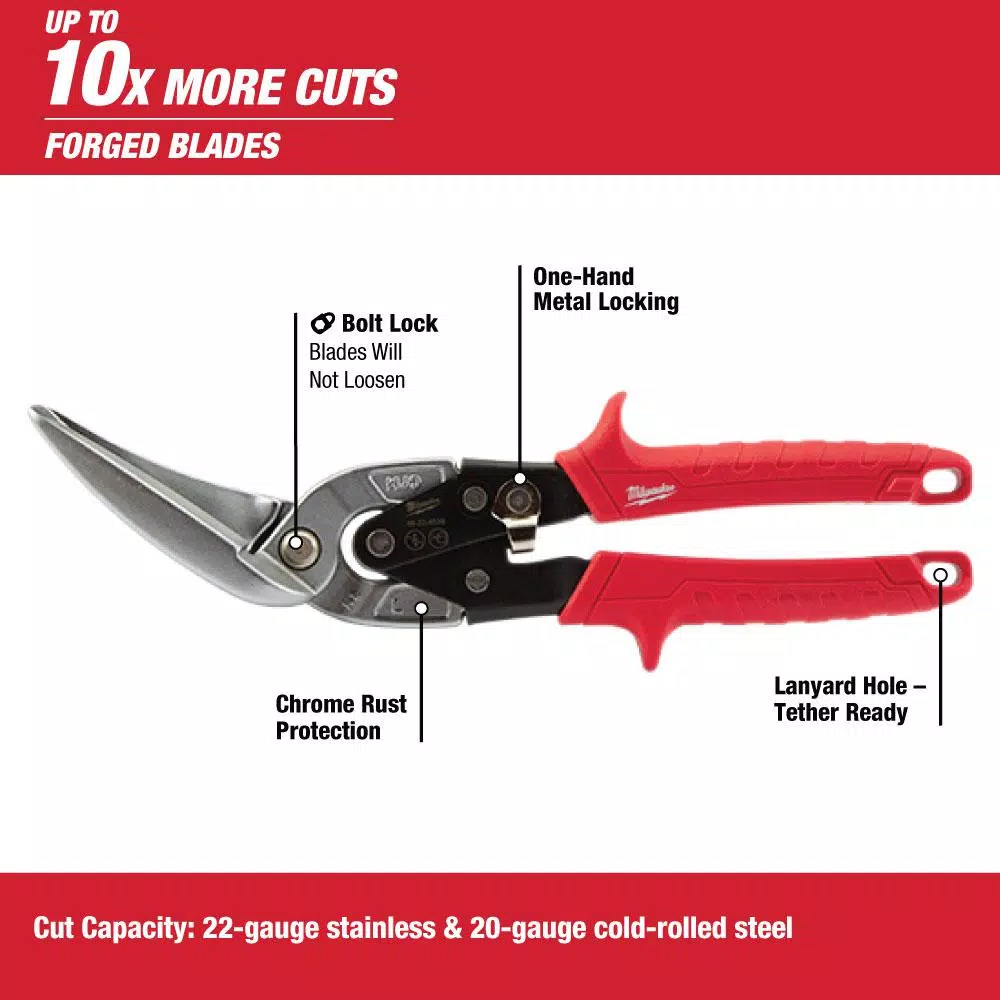Cut more metal than ever with Milwaukee Aviation Snips. The forged blades deliver up to 10X more cuts than cast blades. Bolt Lock prevents the blades from loosening and a durable chrome plating provides rust resistance. A metal lock secures the tool for storage and easily operates with 1 hand. The 3 in. long cut blade is ideal for long cuts, left or straight. The offset model features a 45° offset handle for clearance over the cut material.