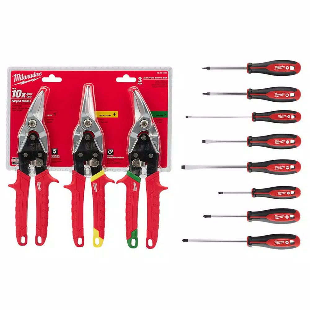 - Includes: Philips #1 x 3 in., Philips #2 x 4 in., Philips #2 x 6 in., slotted 1/4 in. x 4 in., slotted 3/16 in. x 6 in., slotted 5/16 in. x 6 in., square #1, square #2, left, right, and straight aviation snips