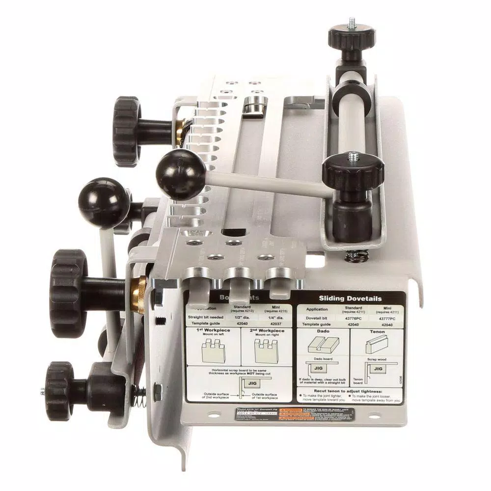 - Includes: Half-Blind/Sliding Dovetail Template (model 4211), Through Dovetail/Box Joint Template (model 4213), Miniature Template (model 4215), Four Router Bits (models 43776pc, 43743pc, 43014pc, 43777pc), Four Template Guides (models 42037, 42040, 42046 and 42054), Two Lock Nuts, Wrench and Operating Manual