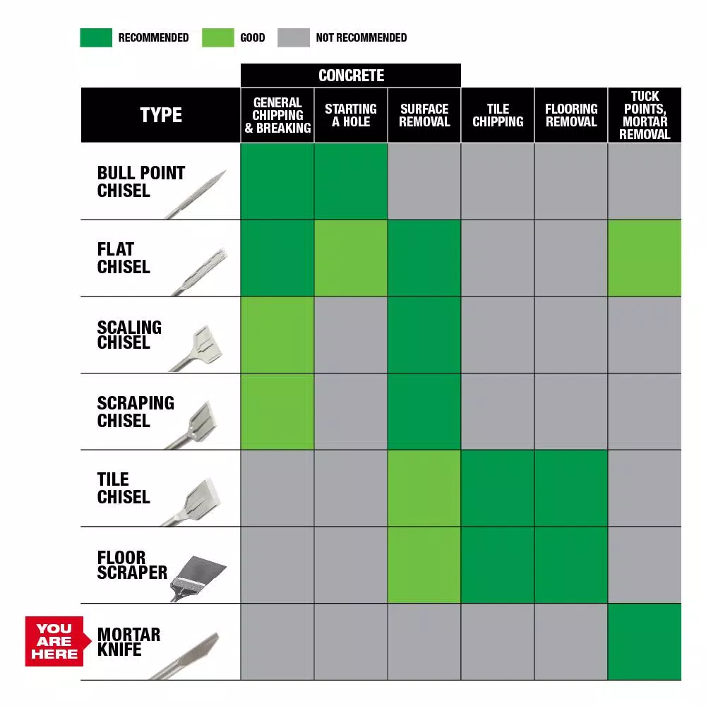 The Milwaukee SDS-PLUS SLEDGE 3/8 in. Mortar Knife stays sharper longer. Reinforced edges deliver maximum durability and reduced wear over the life of the chisel. This mortar knife is optimized with a 3/8 in. profile for horizontal and vertical mortar joints, ideal for removing mortar between bricks. The precision-forged tip helps preserve decorative stone and brickwork and a dust channel provides fast debris removal. Milwaukee engineered this mortar knife to maintain its shape for increased productivity with high grade forged steel for maximum durability. For use with SDS-PLUS rotary hammers.