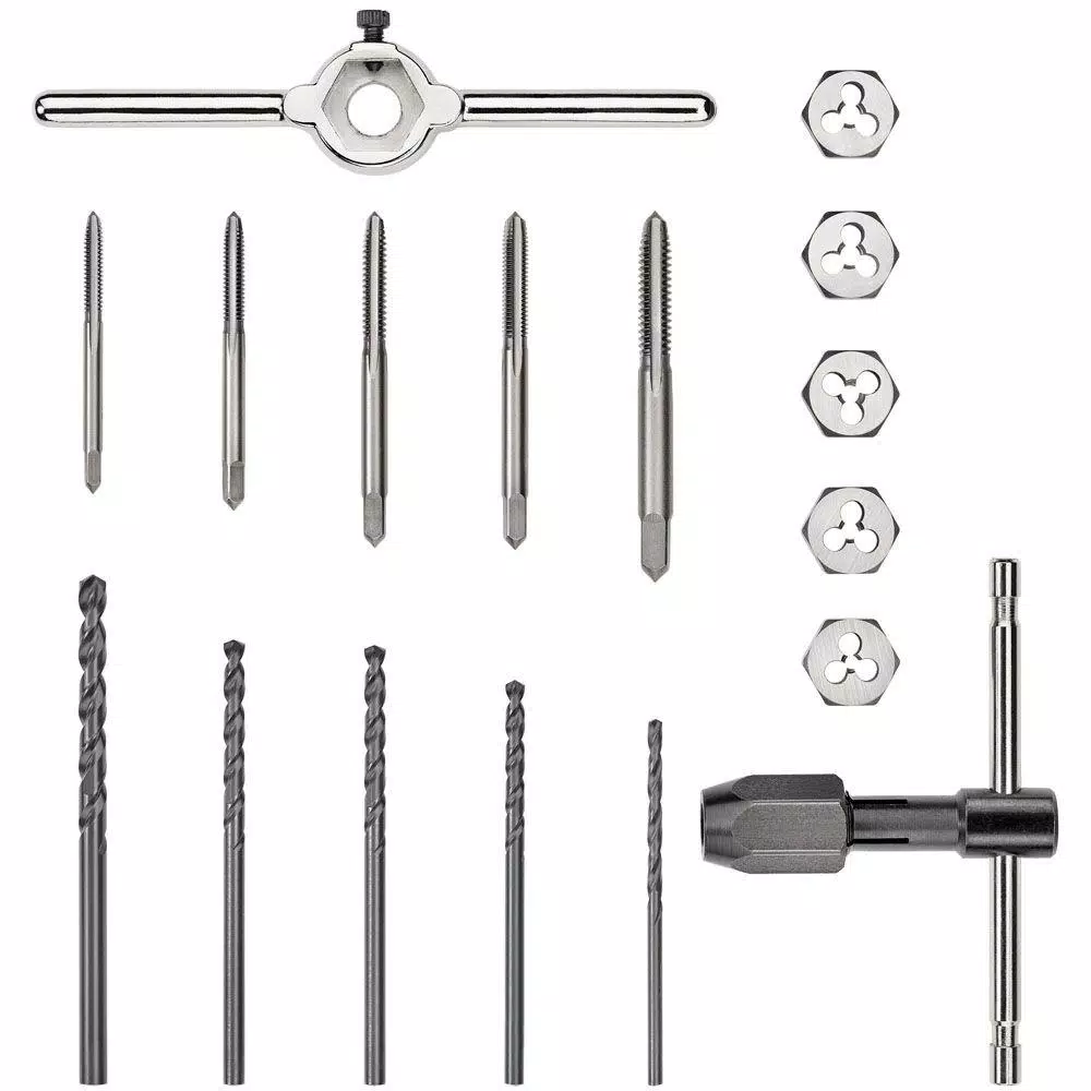 - Includes 1 of each of the following: 6-32 tap, 8-32 tap, 10-24 tap, 10-32 tap, 1/4 in.-20 tap, 6-32 die, 8-32 die, 10-24 die, 10-32 die, 1/4 in.-20 die, # 36 drill bit, #29 drill bit, #25 drill bit, #21 drill bit, #7 drill bit for, 1/4 in. tap handle, 5/8 in. hex die handle
