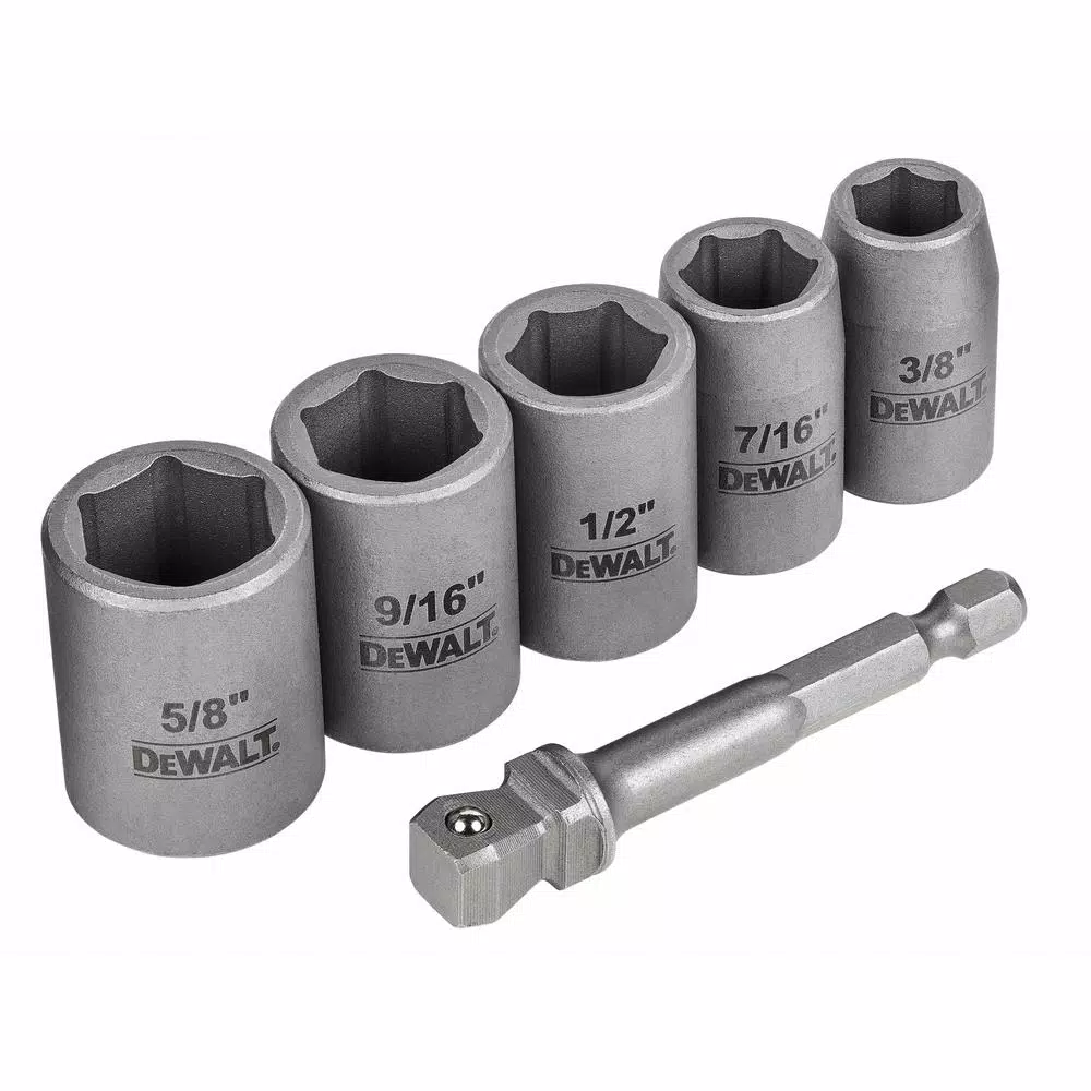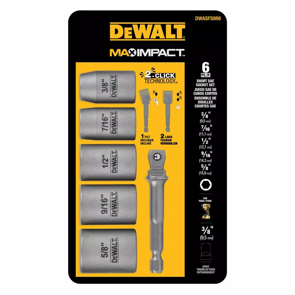 The DEWALT Max Impact 6-Piece Socket Set includes five 3/8 in. Drive Sockets (3/8 in., 7/16 in., 1/2 in., 9/16 in. and 5/8 in.). Set also includes1/4 in. Hex Socket Adapter. The DWASFSMI6 features 2-position sockets, locking in a straight position or 15° pivoted position.