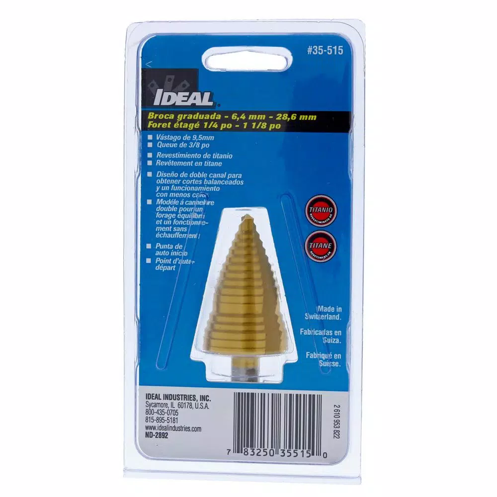 IDEAL step drill bits for precise, repetitive drilling through the toughest materials including brass, carbon steel, cast iron, stainless steel, and more. These tough and reliable tools are constructed with a rugged titanium nitride exterior coating for protection, edge retention and corrosion resistance. Each step is gradually blended to ease stepping through hole sizes; reducing the need to keep changing drill bits. Split point design eliminates the need for a starter hole or punch and delivers three times faster starts, saving valuable time. The double-fluted design provides balanced cuts, more cutting surface compared to a single flute design, and cooler operation.