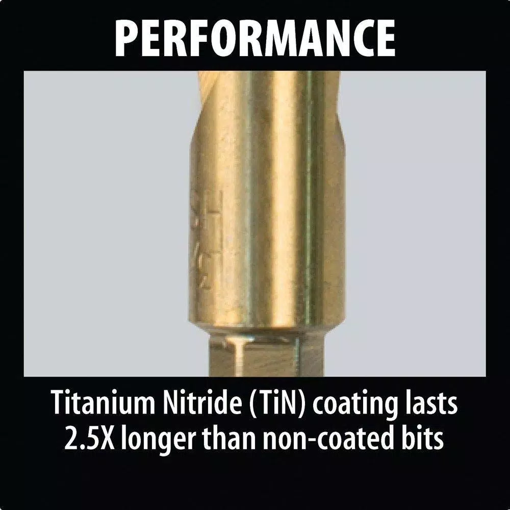 - Titanium nitride (TiN) coating lasts 2.5x longer than non-coated bits