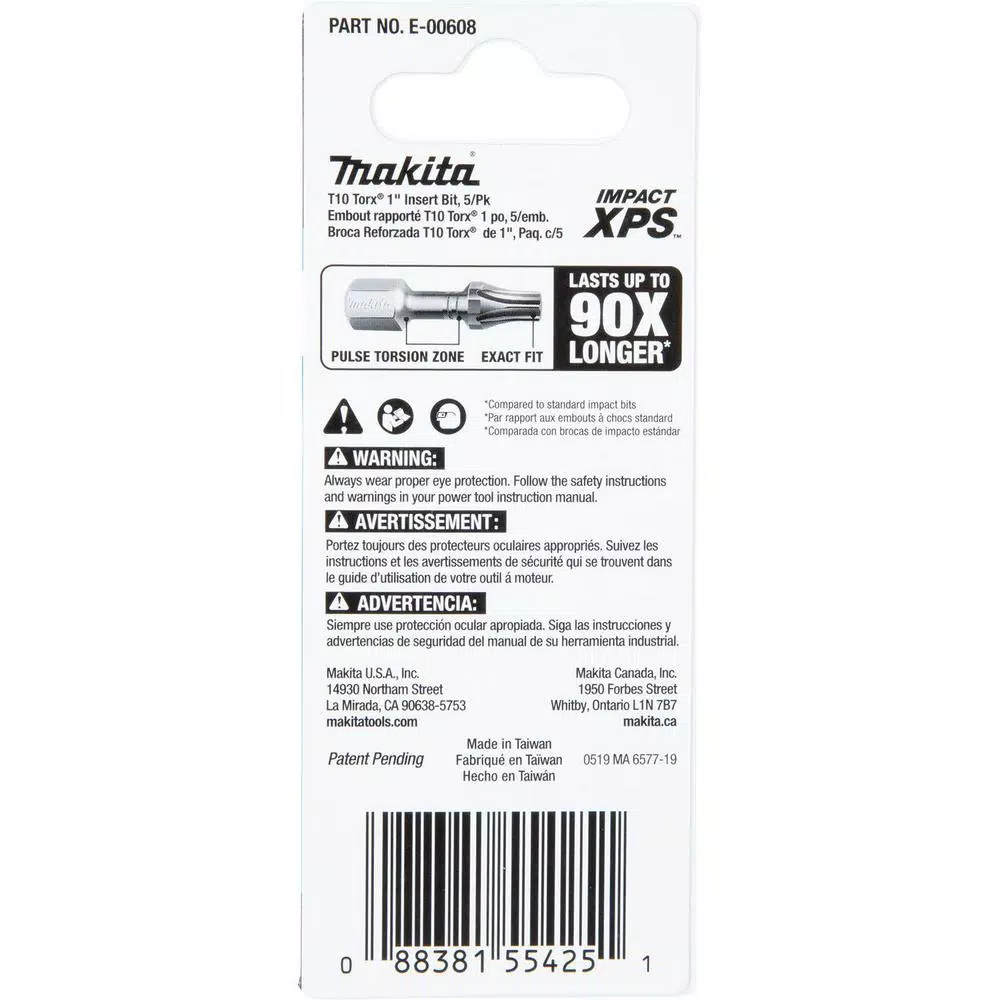 Makita ImpactXPS is new innovation in fastening with insert bits and fastening accessories built for the demands of the professional contractor. The ImpactXPS T10 Torx 1 in. Insert Bits are designed exclusively for use with high-torque impact drivers and are engineered to last up to 90-times longer than standard insert bits. High-strength steel delivers longer bit life and the precision-fit tip is engineered to prevent cam-out and stripping. The torsion section of the bit flexes under load to take pressure off of the bit tip for increased durability. The high quality steel construction is engineered for increased durability and features a matte nickel surface for best in class corrosion resistance. ImpactXPS T10 Torx 1 in. Insert Bits are ideal for the most demanding jobs including deck building, framing, installing plywood subfloor and more.
