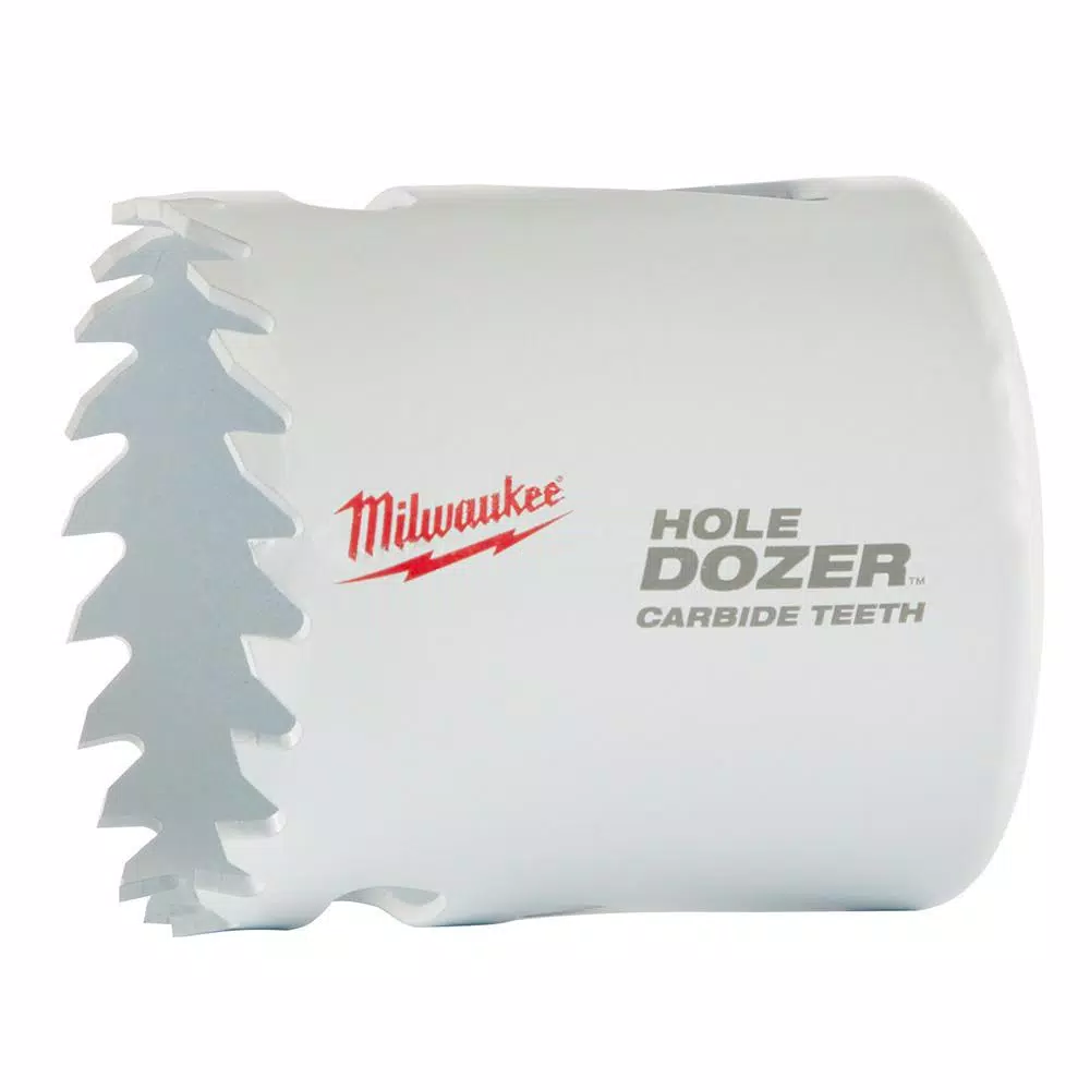 The MILWAUKEE HOLE DOZER with Carbide Teeth is the best hole saw solution for metal and multi-material applications. The hole saw provide 50X life in extreme metal and multi-material cutting compared to other bi-metal hole saws. A tough carbide-grade build is combined with a durable 4 TPI design, yielding the best carbide tooth durability and longest life in stainless steel, abrasive material and fastener-embedded wood applications. The HOLE DOZER has a cutting depth of 1.62 in., allowing clearance to handle cuts in a wide range of materials. Thermal coating on the saw reduces friction and drag during cutting. Cordless efficiency also allows for faster cutting in all applications. The hole sawslug is easy to remove with The Plug Jack, enhancing user productivity by providing the best access and leverage to remove material slugs.