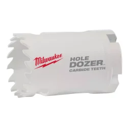 The MILWAUKEE HOLE DOZER with Carbide Teeth is the best hole saw solution for metal and multi-material applications. The hole saw provide 50X life in extreme metal and multi-material cutting compared to other bi-metal hole saws. A tough carbide-grade build is combined with a durable 4 TPI design, yielding the best carbide tooth durability and longest life in stainless steel, abrasive material and fastener-embedded wood applications. The HOLE DOZER has a cutting depth of 1.62 in., allowing clearance to handle cuts in a wide range of materials. Thermal coating on the saw reduces friction and drag during cutting. Cordless efficiency also allows for faster cutting in all applications. The hole sawslug is easy to remove with The Plug Jack, enhancing user productivity by providing the best access and leverage to remove material slugs.