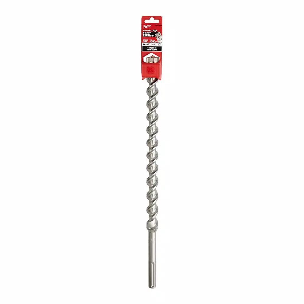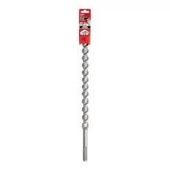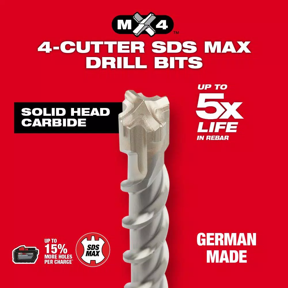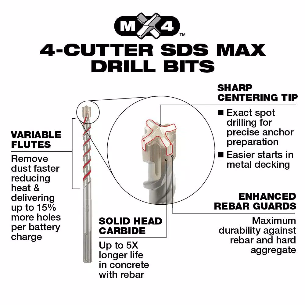 The MILWAUKEE® SDS-MAX 4-Cutter MX4™ 1-1/8″ X 17″ X 21″ Drill Bits feature carbide heads that deliver up to 4x longer life in concrete with rebar. Engineered with rebar guards to provide maximum durability in hard aggregate and rebar. MX4™ 4-Cutter bits are designed with sharp centering tips for exact spot drilling in concrete. The integrated 4-cutter design prevents lock-up in rebar, reducing downtime. Variable flutes remove dust faster, reducing heat and delivering up to 15% more holes per battery charge. Wear mark indicator shows users the end of life when the bits no longer meet the ANSI requirement. The Milwaukee MX4™ 4-Cutter Drill Bits are ideal for concrete with rebar and masonry applications.