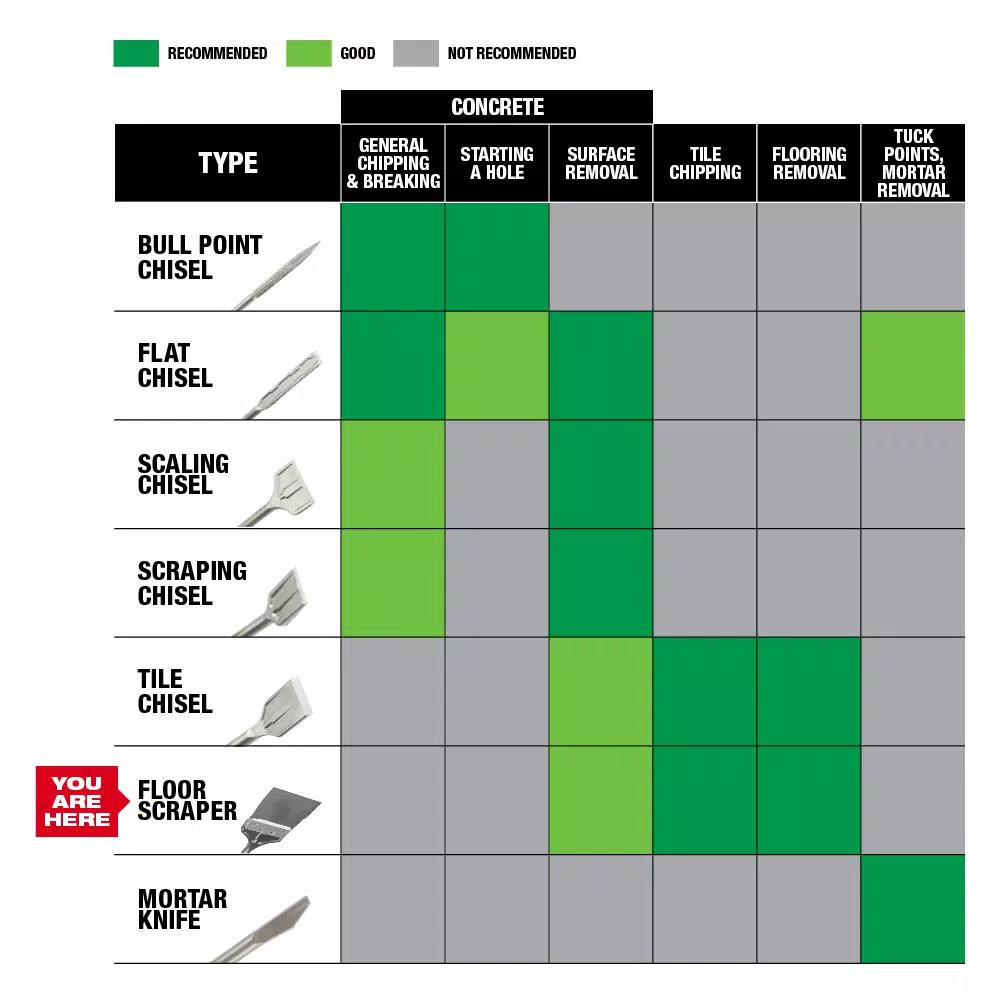 The Milwaukee SDS-MAX SLEDGE Floor Scraper stays sharper longer. Optimized design delivers up to 2x faster material removal. The SLEDGE Floor Scraper is ideal for tile, linoleum, laminate and adhesive removal. This floor scraping chisel has a 6 in. wide blade for increased productivity. The sharpened, flexible blade cuts under material faster with a beveled plate edge to prevent material binding. The countersunk bolts reduce loosening and high grade forged steel provides maximum durability. For use with SDS-Max rotary hammers.