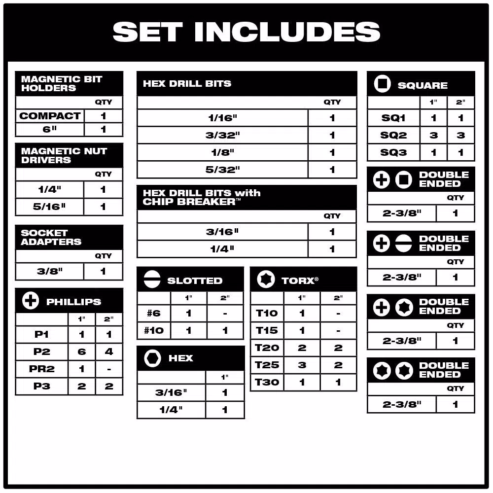 - Includes: Compact Magnetic Bit Holder; 6″ Magnetic Bit Holder; (27) 1″ Insert Bits: P1, (6) P2, (2) P3, PR2, SQ1, (3) SQ2, SQ3, T10, T15, (2) T20, (3) T25, T30, SL1/8″, SL1/4″, 3/16″ Hex, 1/4″ Hex; (18) 2″ Power Bits: P1, (4) P2, (2) P3, SQ1, (3) SQ2, SQ3, (2) T20, (2) T25, T30, SL1/4″; (4) Double Ended Bits: P2/SQ2, P2/SL1/4″, P2/T25, T20/T25; (2) Magnetic Nut Drivers: 1/4″, 5/16″; (6) Hex Shank Drill Bits: 1/16″, 3/32″, 1/8″, 5/32″, 3/16″, 1/4″; Socket Adapter:1/4″ Hex to 3/8″ Square