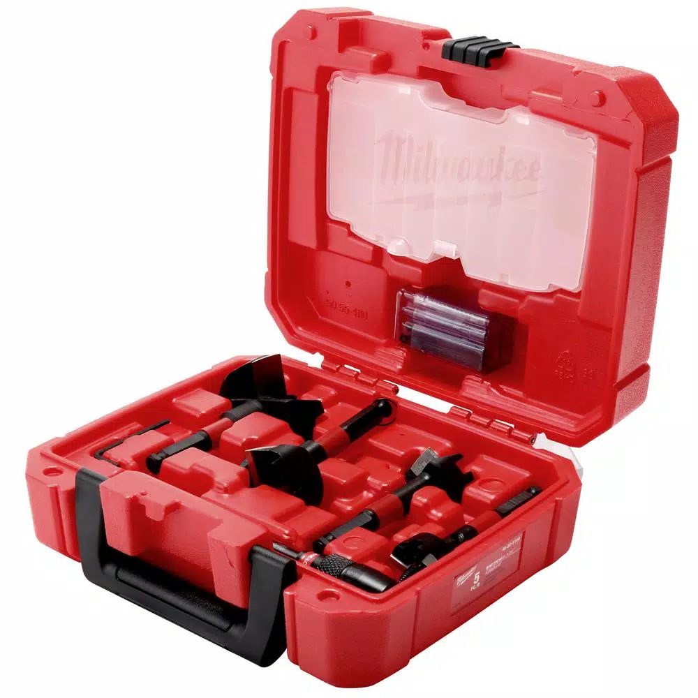 The 5-Piece SwitchBlade Bit Plumber’s Kit offers a convenient assortment of the Milwaukee SwitchBlade Selfeed Bits commonly used on the jobsite. Milwaukee SwitchBlade Selfeed Bits drill up to 12% faster and deliver up to 2X longer life. Designed for any trade that demands repetitive cutting of large holes in wood, SwitchBlade bits allow you to remove and replace blades rather than resharpen. You get a new bit with every quick, convenient change of the hardened steel blade and less downtime on the job. An aggressive feed screw design enables the bit to pull through quickly for faster drilling. Built to last and designed to perform, Milwaukee SwitchBlade Selfeed bits deliver more holes for the money. The kit includes bits in diameters 1-3/8 in., 1-1/2 in., 2-1/8 in. and 2-9/16 in. Also included are 4 replacement blades, 4 feed screws, 4 set screws, a 5-1/2 in. Quik-Lok extension and a hex key, all in an impact resistant carrying case.