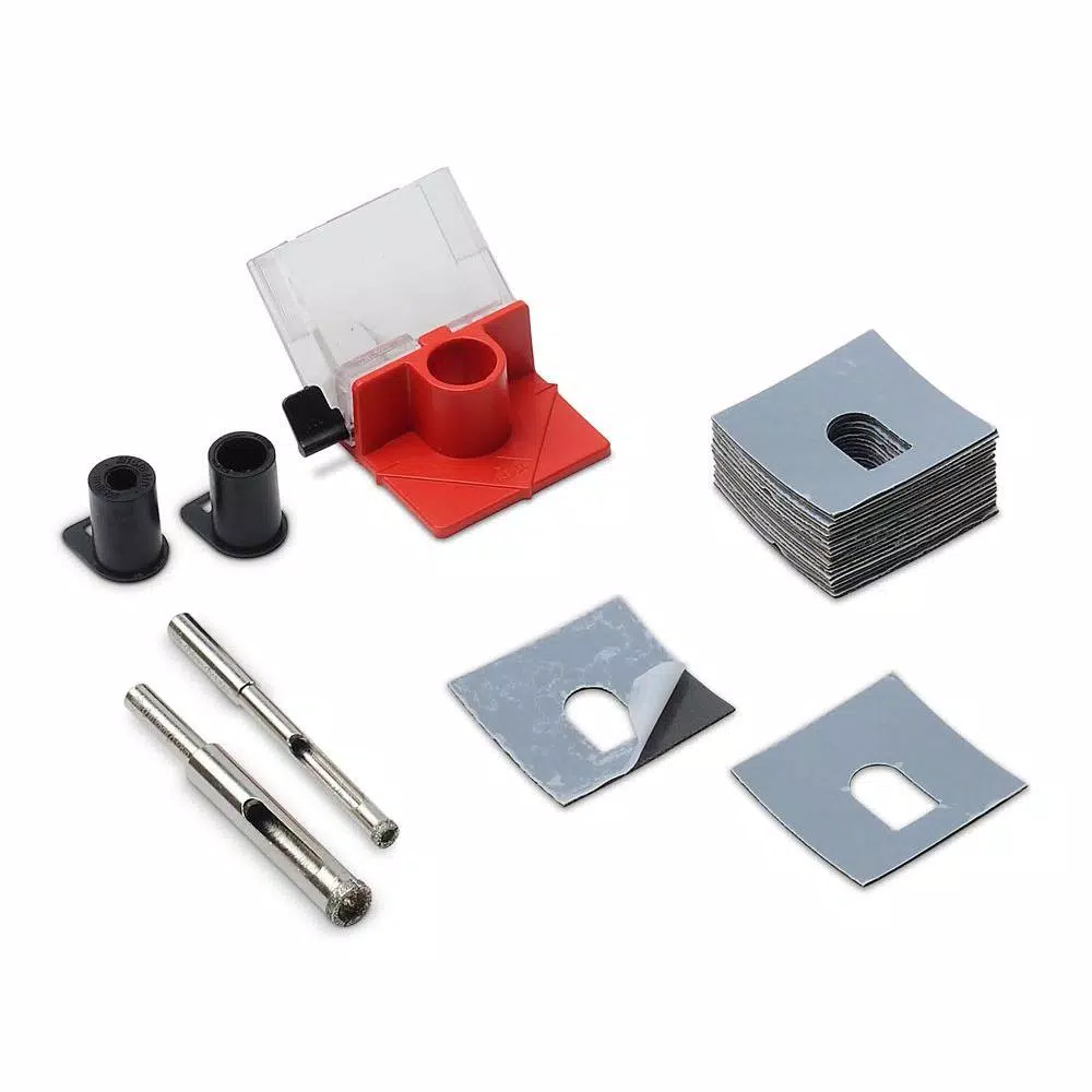 The Rubi EASY GRES kit is used to drill holes both vertically and horizontally. Its functional design incorporating a water tank with flow control valve simplifies the process of drilling holes in porcelain, stone and ceramic. The EASY GRES guide attaches easily to any surface, thanks to its renewable adhesive.