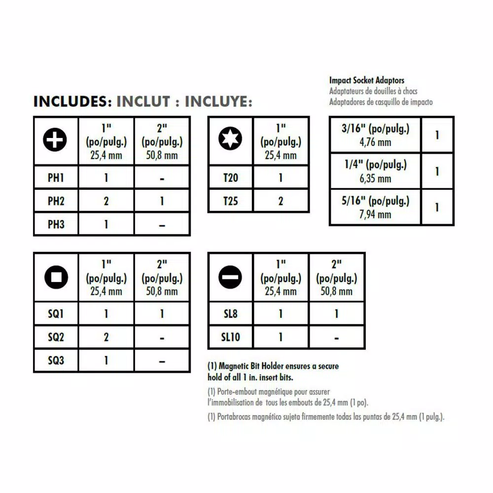 - 1 in. bits are great for use with the included magnetic bit holder