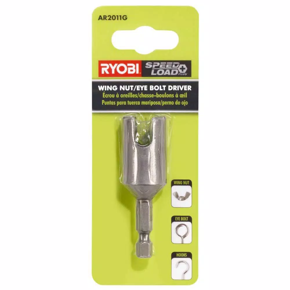 RYOBI introduces the SpeedLoad+ Wing Nut/Bolt Driver. How many times have you used a screwdriver to tighten a wing nut? This bit chucks into any drill to make tightening of these bolts faster and easier than you would ever believe. It works with any size wing nut or eye/hook bolt.
