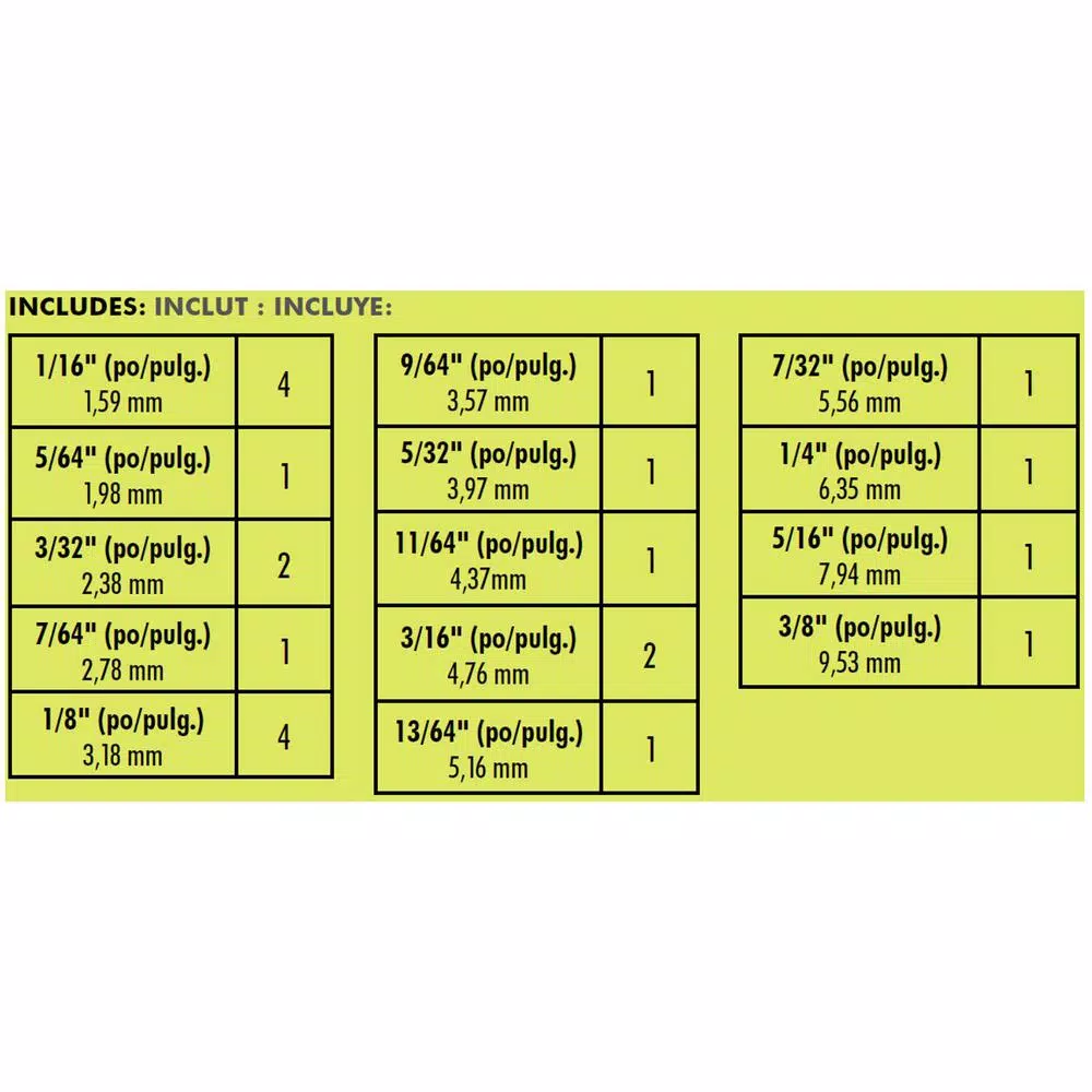 - Includes: (22) Titanium Coated Bits, sizes 1/16 in. to 3/8 in.