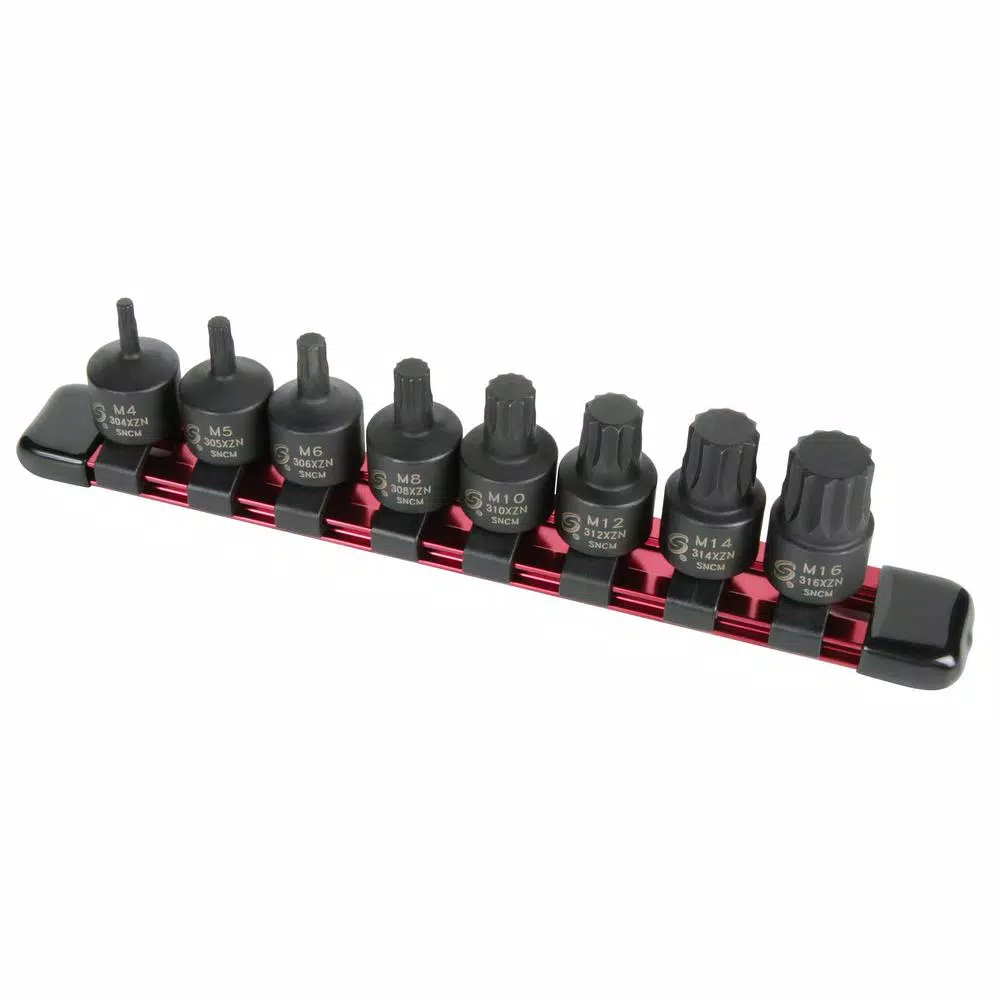 This is an impact bit set with 8-Piece. It is 3/8 in. drive and stubby, triple square design. Includes a clip rail for storage.
