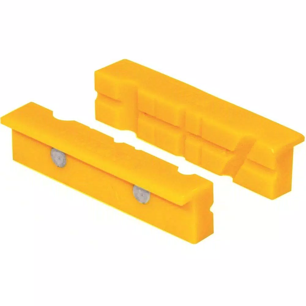 A valuable accessory for hardened and serrated metal jaw bench vises is a good set of protective non-marring jaws for times when you need to grip a finished surface without damaging it. BESSEY’s BV-NVJ nylon vise jaws are hard enough to be durable yet supple enough to protect finished surfaces. Easy to attach and remove, they fasten quickly onto steel vise jaws with 2 magnets. V-grooved to aid in holding irregular or rounded surfaces.