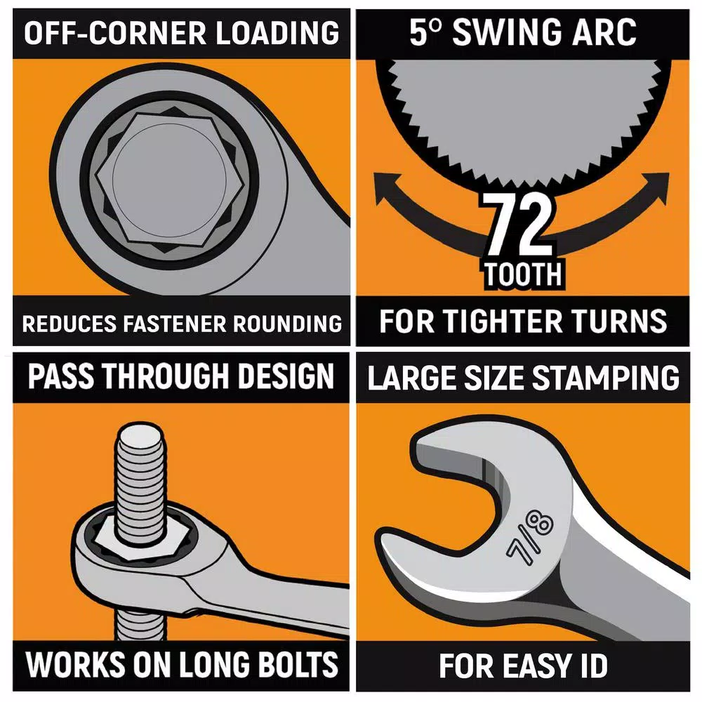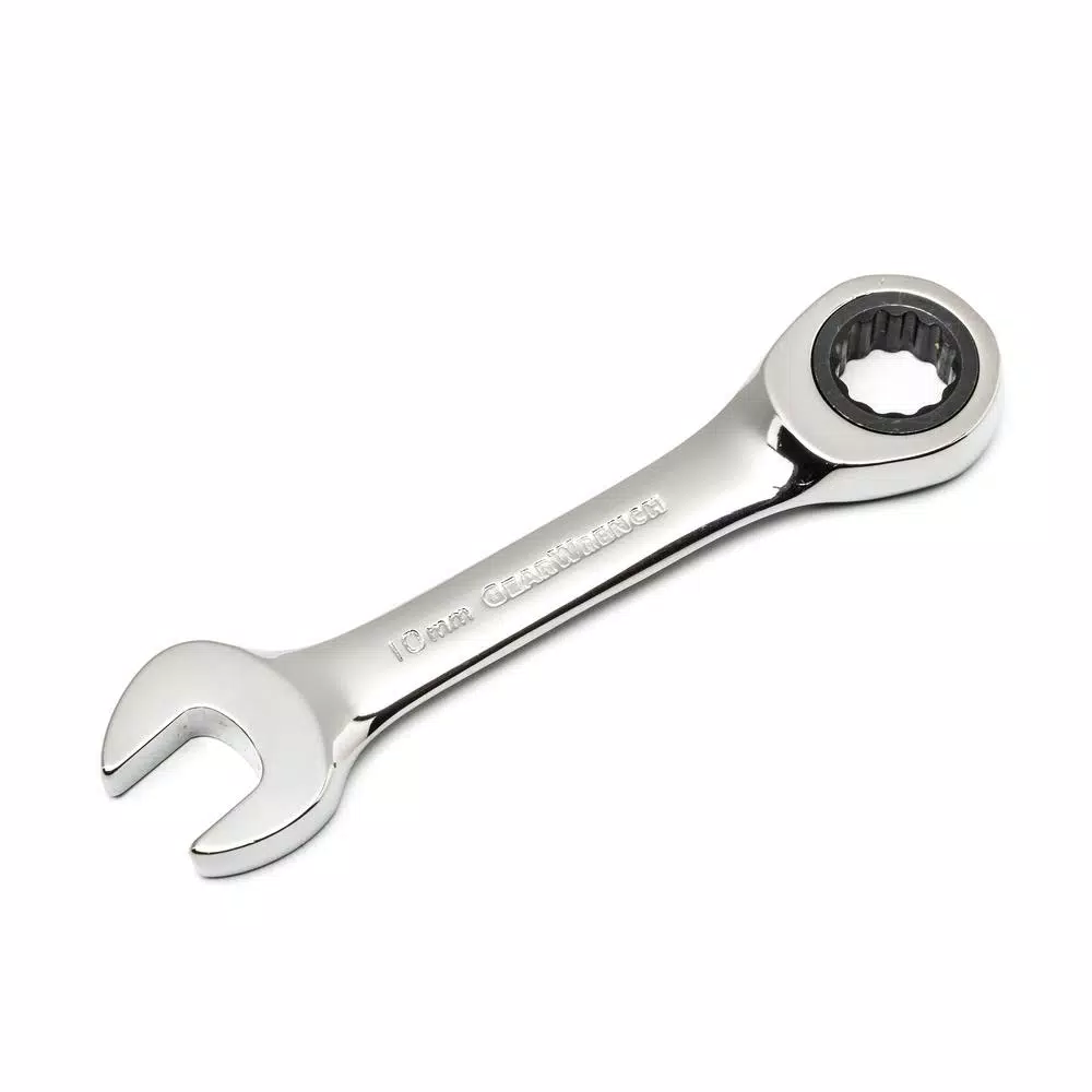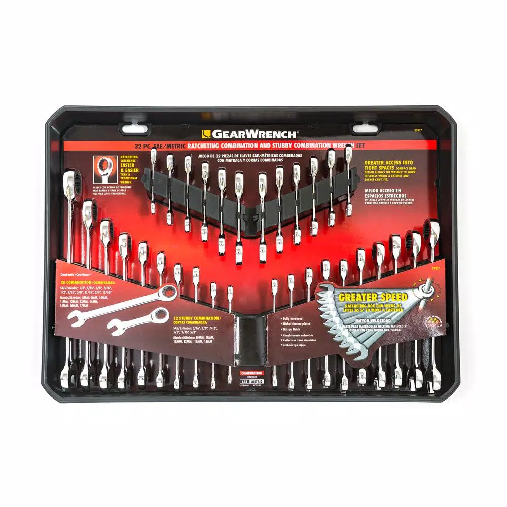 With a thin head shank that will let you in to almost any area and a special set of stubby wrenches that can squeeze into even tighter spots, the GearWrench 32-pc combination wrench set, SAE/mm greatly expands your ability to remove or tighten any fastener. With sizes in both metric and in., the set has the range you want. The 12 points of contact on the ratcheting box end ensure better grip with no slip, while the open end lets you finish the job with ease.