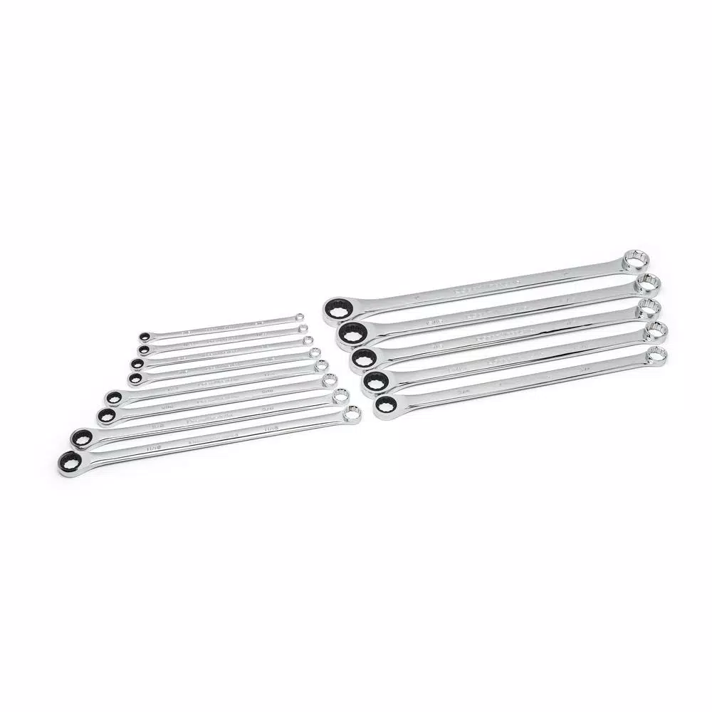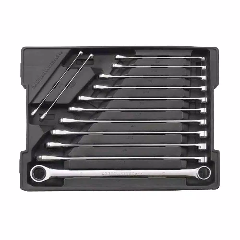 The GearWrench 13-Piece SAE XL Gearbox Double Box Ratcheting Wrench Set features a full chrome polish finish for durability and corrosion resistance. Ratcheting box end increases productivity while reducing hand fatigue. The box end utilizes Surface Drive technology which provides off-corner loading for better grip and reduced fastener rounding.