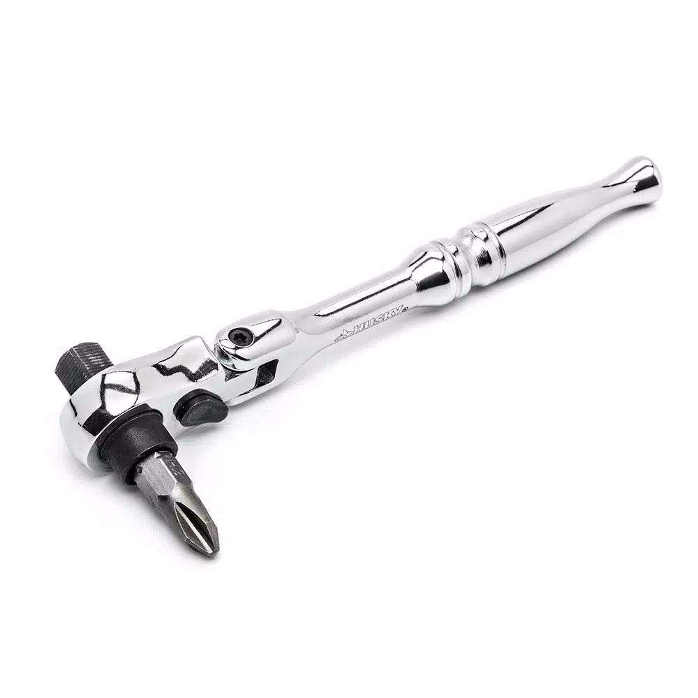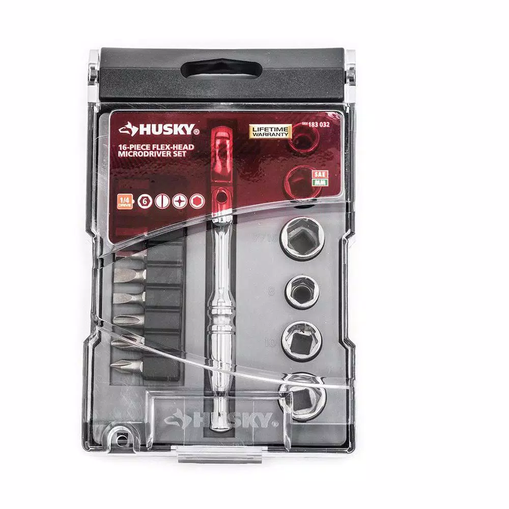 The Husky 16-piece micro driver set is the perfect tool for reaching those fasteners in extremely confined spaces. The dual-sided ratchet accepts 1/4 in. bits and 1/4 in. drive sockets. The head flexes 180° and is equipped with a reversing lever for quick directional changes. This a great set for the professional mechanic or the DIYer needing access to fasteners in tight spaces.