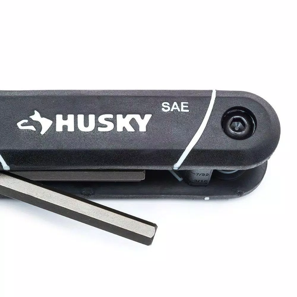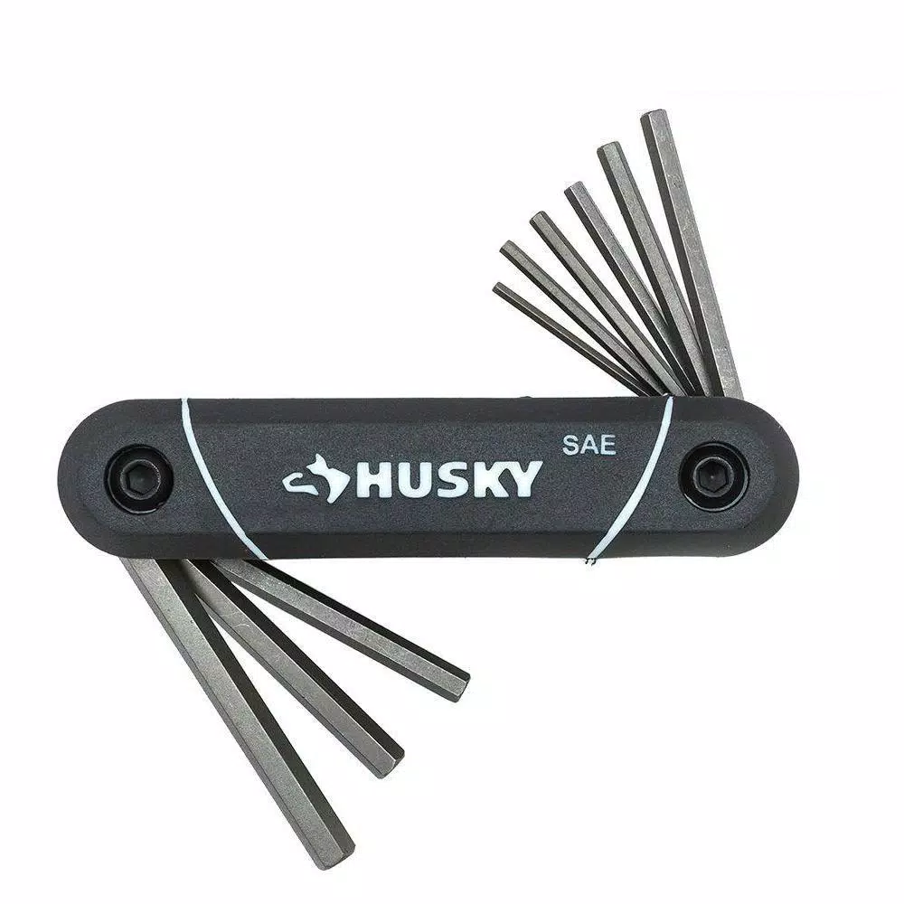 The Husky 9-Piece SAE Folding Hex Key Set is constructed of alloy steel for strength and long-lasting performance. The finish provides resistance to corrosion. The keys fold up within the handle for efficient organization.