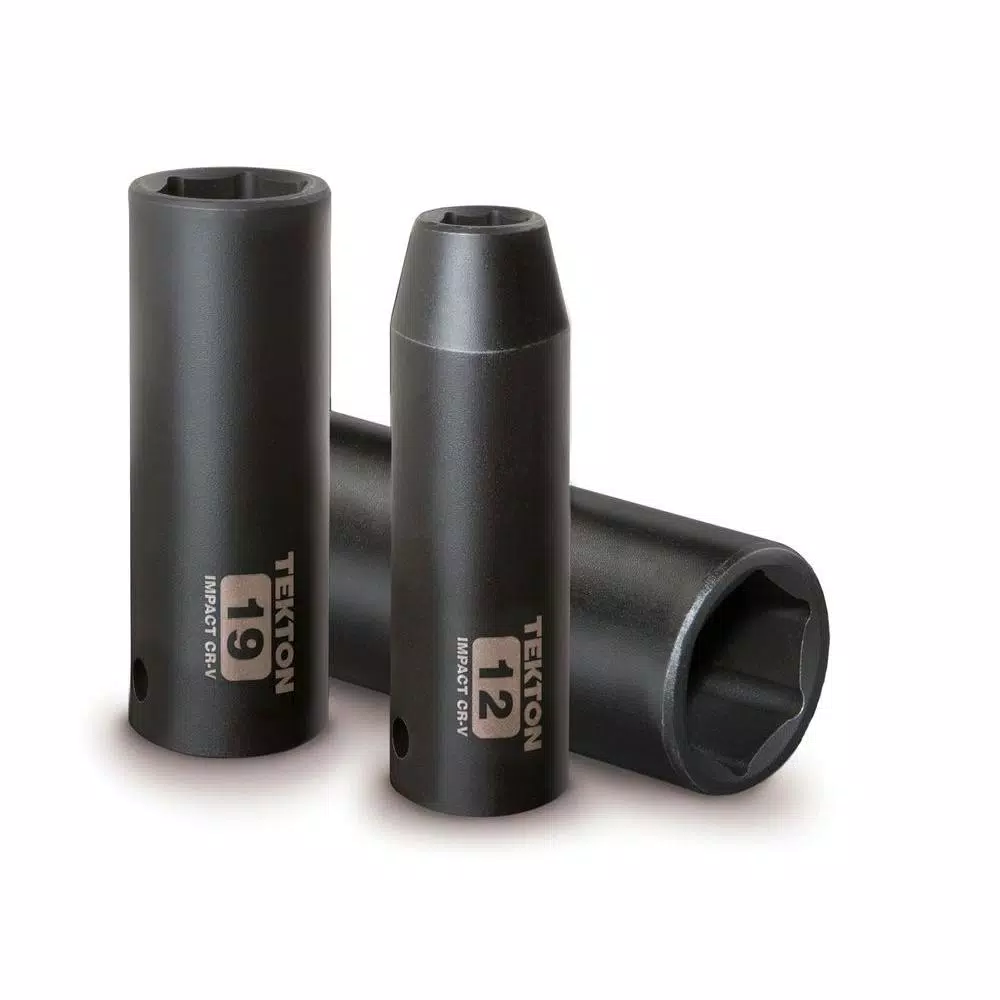 Built for use with impact tools, the TEKTON 1/2 in. Drive Deep Impact Sockets effortlessly break free rusty suspension and exhaust bolts, quickly remove stuck lug nuts, and loosen crank bolts with ease. TEKTON impact sockets efficiently transfer torque from impact wrench to fastener, loosening the most stubborn nuts and bolts. Made from high-strength chrome vanadium steel, our impact sockets are more resistant to drive end round out than standard impact sockets, resulting in a longer useable life. TEKTON impact sockets meet or exceed ANSI performance standards. The high-torque, 6-point socket grips the broad, flat sides of nuts and bolts, not just the corners, so there is no need to worry about stripping fastener head or damaging socket. An extra-deep broach enables you to access the entire length of fasteners. Even in low light, the high-contrast, permanent laser etched size markings are easy-to-read. The customized red TEKTON case can be stored in a tool chest or carried to your job site. Molded size markings keeps set organized and identifies any missing sockets.