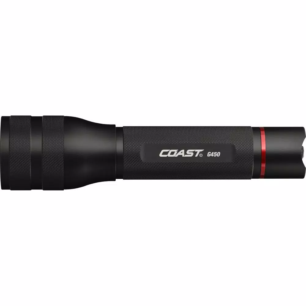 The G450 Flashlight uses Coasts Pure Beam Focusing Optic System with Twist Focus to harness the light and create a superior beam quality from spot to flood. The Bulls Eye spot beam pattern gives you a great focused spot while producing an outer ring of flood light which allows you to see a broader area to the sides. The flood beam is broad and consistent, giving you a clear field of vision not seen with typical focusing flashlights. A quick cycle switch allows you to select light output settings with ease. Built tough, an impact-resistant, lightweight aluminum casing resists rust and corrosion. The G450 also features an unbreakable LED and rubberized O-ring for reliable water resistance and durability. With Coasts commitment to quality, the G450 Flashlight is impact resistant, weather resistant and its LED is virtually unbreakable. The G450 Flashlight is backed by Coasts lifetime warranty against defects in materials and workmanship. Tested and rated to ANSI/FL1 standards.