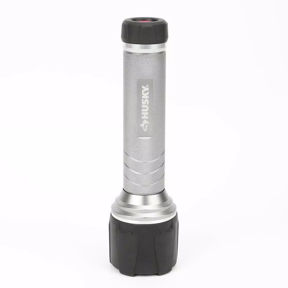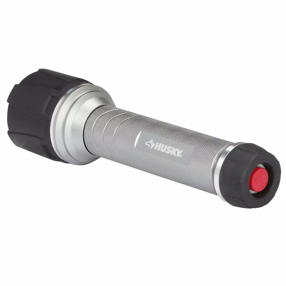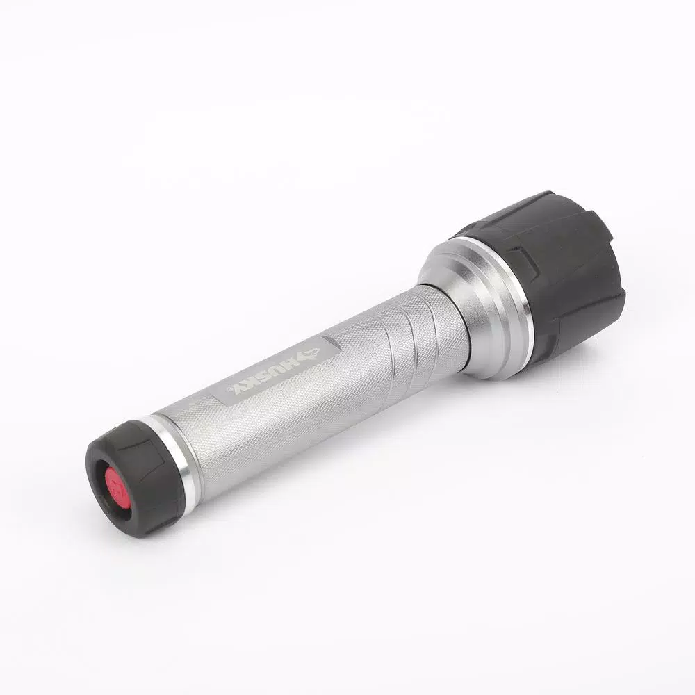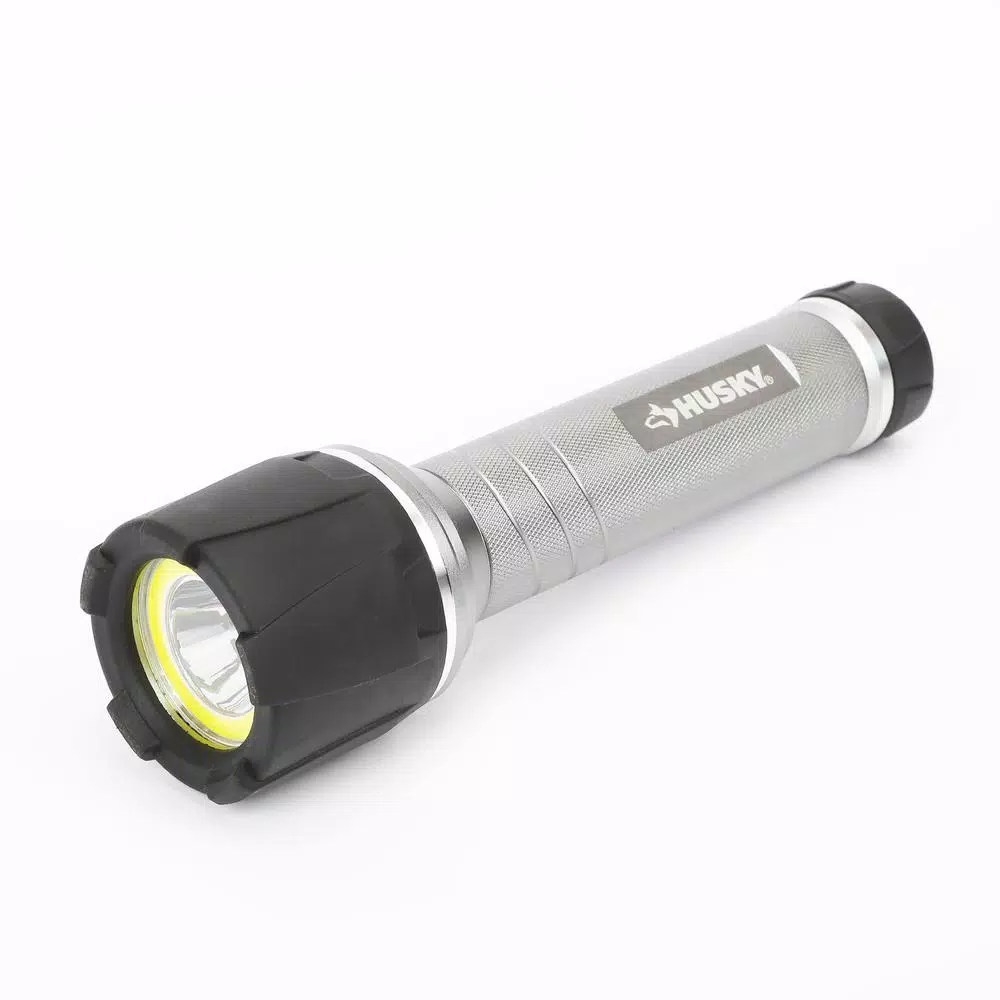 The Husky 500 Lumens Dual beam unbreakable Flashlight features durable aluminum. With high power LED and COB chip for wide range lighting. The light provides 3 modes of operation, spot, flood, both spot and flood. Drop test rated from 30 ft. and water-proof to 1 m. It is with super bright LED and Energizer Alkaline battery is included, up to 500-Lumen.
