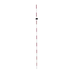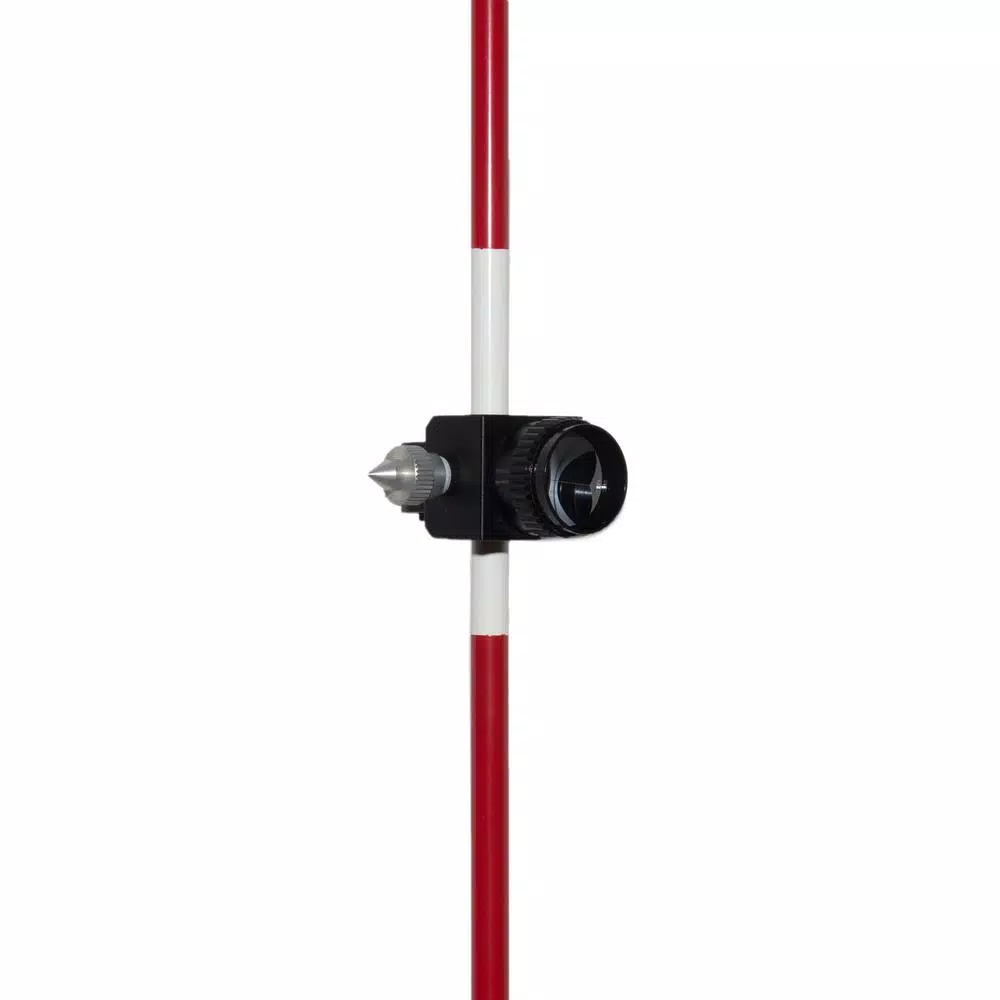 The AdirPro Mini Prism System with Pin Pole 720-11 features a 25 mm silver-coated prism with a 0 mm offset attached to a holder that slides up and down the included pin pole. The 0.48 in. (12.2 mm) Dia pin pole has 3.94 in. (10 cm) L red and white sections that make up 3 adjustable sections for a total height of 5.91 ft. (71 in. to 1.8 m). These adjustable sections can be fully secured with the knob lock, which also includes a built-in level vial with 40-minute sensitivity. The prism pole system comes with a replaceable stainless steel point for the pole, an accessory kit with a plumb bob hook, a cone for attachment to the prism, and a carrying case.