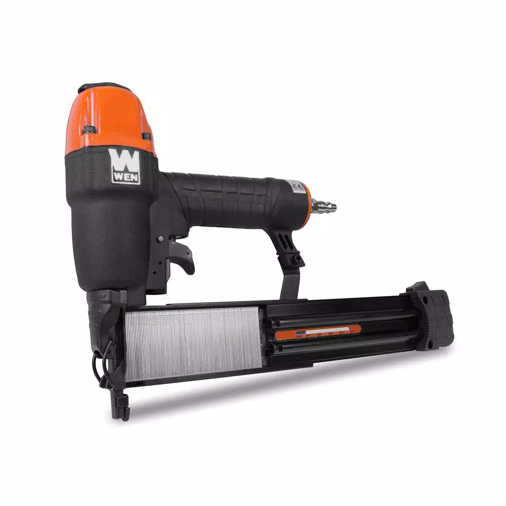 Remember when you could build whatever you wanted? Nail nails and fasten fasteners with the WEN 18-Gauge 2 in. Pneumatic Brad Nailer. Fire 18-gauge brads anywhere from 3/8 to 2 in. in length. Our spring loaded magazine makes for quick and easy reloads with enough space to hold up to 106 nails. The lightweight body combined with the rubber-lined handle limit fatigue during long days on the job. Operating pressure ranges rom 60 to 115 PSI with the nailer consuming 0.028 CFM of air per nail at 88 PSI. The 1/4 in. NPT air inlet allows for quick connection to your favorite air compressor. Adjust the firing depth of the nailer with the simple turn of the depth adjustment wheel. Check the amount of remaining nails through the gauge window mounted on the side of the magazine. Unlatch the front nose to clear jams quickly and easily. Adjustable air exhaust lets users direct the pneumatic air output in any direction while the powder-coated finish prevents wear and tear to the nailers body. This package also includes lubricating oil, hex keys, 500 3/8 in. nails, 500 3/4 in. nails, 500 1 in. nails, and 500 2 in. nails. And, because its a WEN product, your nailer comes backed by a two-year warranty and a friendly customer help line all to make sure you remember WEN.