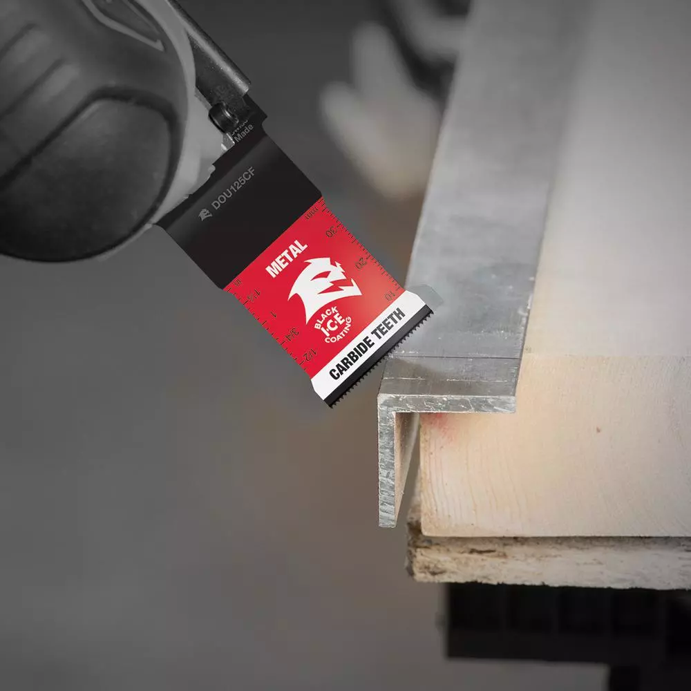 DIABLO’s universal fit carbide oscillating blades feature application specific designs that deliver extreme durability and superior cutting life in metals. High-performance carbide teeth deliver an unmatched up to 50X longer cutting life versus standard bi-metal blades. An optimized blade and tooth design along with Black I.C.E. (Industrial Cooling Element) keeps the teeth cool and build up free for fast, clean cuts. The blade’s universal fit, adapter-free design easily attaches to most tools, with the exception of Starlock tools.