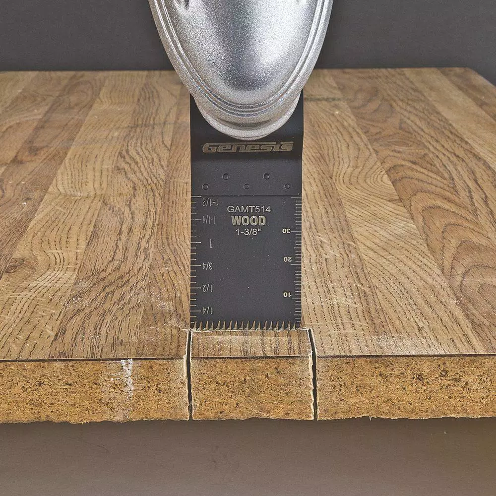 Precision Flush Cut Blade is a 1-3/8 in. wide blade for aggressive plunge cuts and flush cuts in wood, plastic, drywall. High-carbon steel blade cuts through these as well as other soft materials up to 1-9/16 in. deep. GAMT514 Precision Flush Cut Blade is an excellent accessory for our popular Genesis GMT15A, GMT16V and GMT25T oscillating tools.