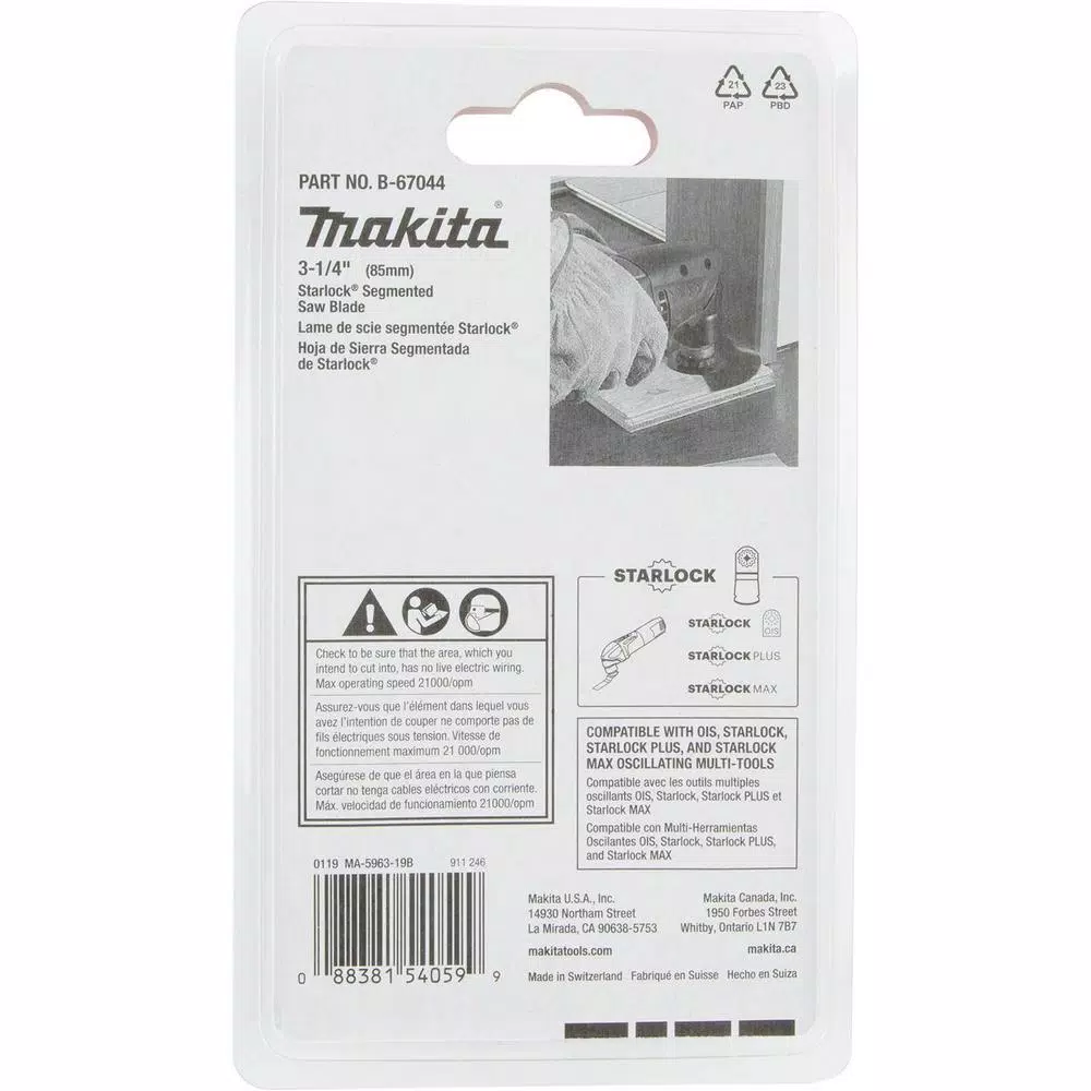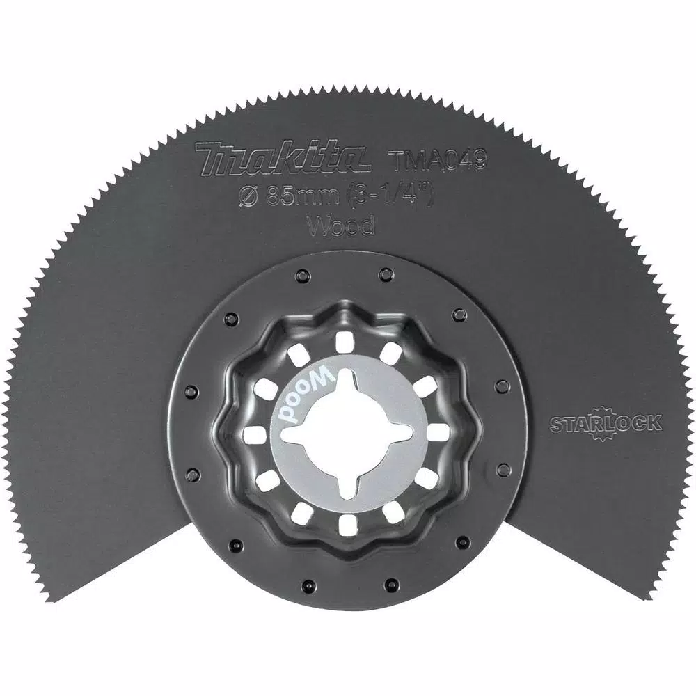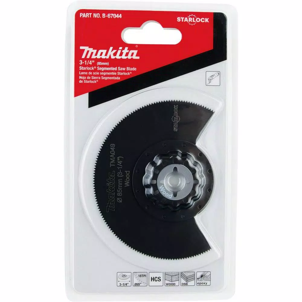 The Makita 3-1/4 in. Starlock Segmented Blade is engineered for plunge and accurate cutting. The blade is ideal for plunging into soft wood, laminated floors, and drywall. The blade features an ultra-thin 0.55 in. kerf. The high carbon steel edge works for general-purpose wood cutting applications. The Starlock Interface provides maximum performance and is compatible with most oscillating multi-tools (sold separately).
