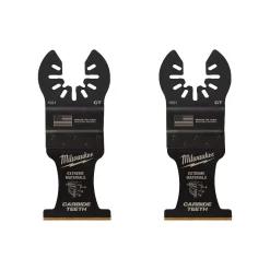 The MILWAUKEE Universal Fit OPEN-LOK 1-3/8 in. Titanium Enhanced Carbide Teeth Extreme Material Blade 2 Pack is designed for Oscillating Multi-Tools. It has a unique aggressive tooth design that offers users optimal cutting performance in wood, screws, metal pipe, nails, cement board, plaster, and more. The 1-3/8 in. Titanium Enhanced Carbide Teeth Extreme Material Blade lasts up to 50X longer than standard bi-metal blades and can be used in a wide range of materials for the longest blade life. The unique, aggressive carbide tooth design offers faster cuts and better cutting performance in wood when compared to standard carbide blades. These Milwaukee multi-tool blades are designed with global materials.