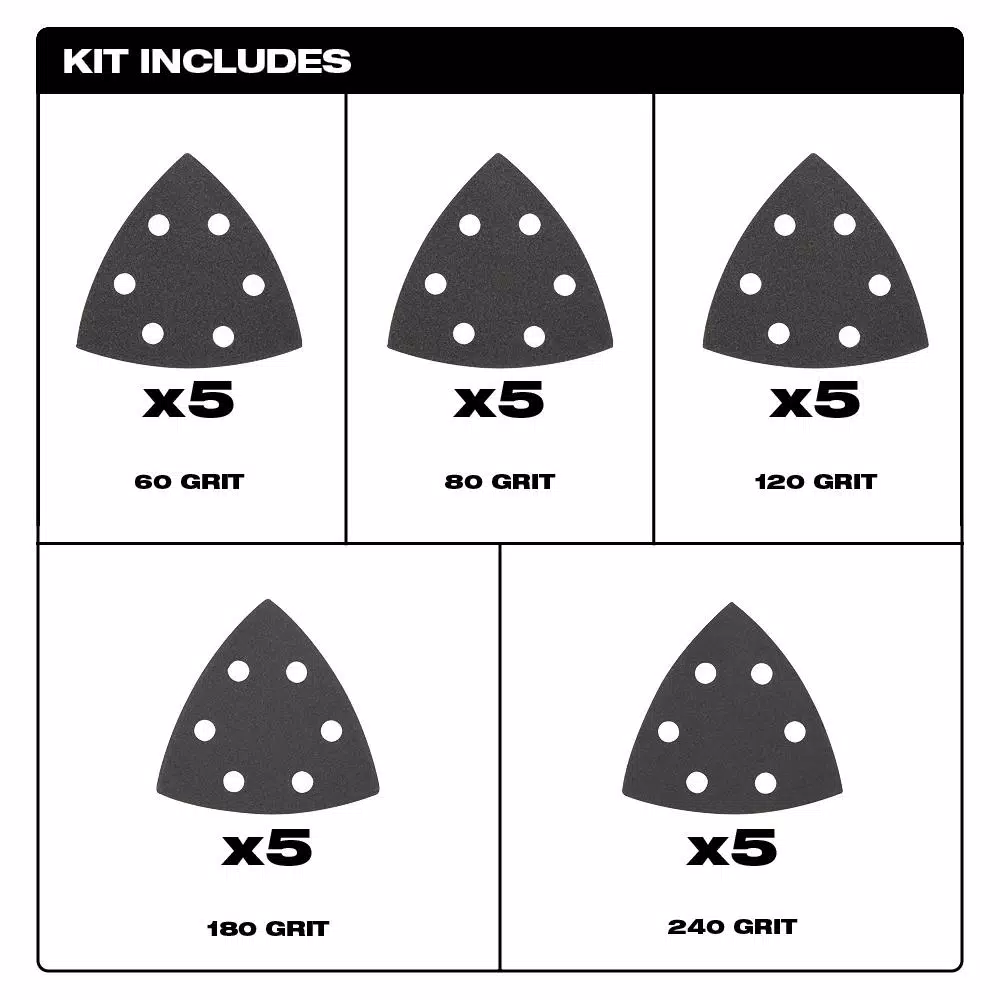 The Milwaukee Universal Fit OPEN-LOK 6-Piece Oscillating Multi-Tool General Purpose Blade Kit provides users with an assortment of blades for cutting hardwood, wood and nails, wood, PVC, and drywall. The included Titanium Enhanced Bi-Metal Blades use premium high-speed steel and last up to 15X longer than standard high carbon steel (HCS) blades. The Milwaukee Universal Fit OPEN-LOK 2 in. Rigid and 2 in. Flexible Scraper 2-Piece Combo Pack is for Oscillating Multi-Tools. These multi-tool scrapers have a solid stainless steel construction with a sharp ground edge, ideal for quick removal of paints, adhesives, and sealants. The Milwaukee Universal Fit OPEN-LOK 3-1/2 in. Triangle Sandpaper 25-Piece Variety Pack is designed for Oscillating Multi-Tools. The 3-1/2 in. Triangle Sandpaper utilizes Hook and Loop technology for fast and secure paper changes.