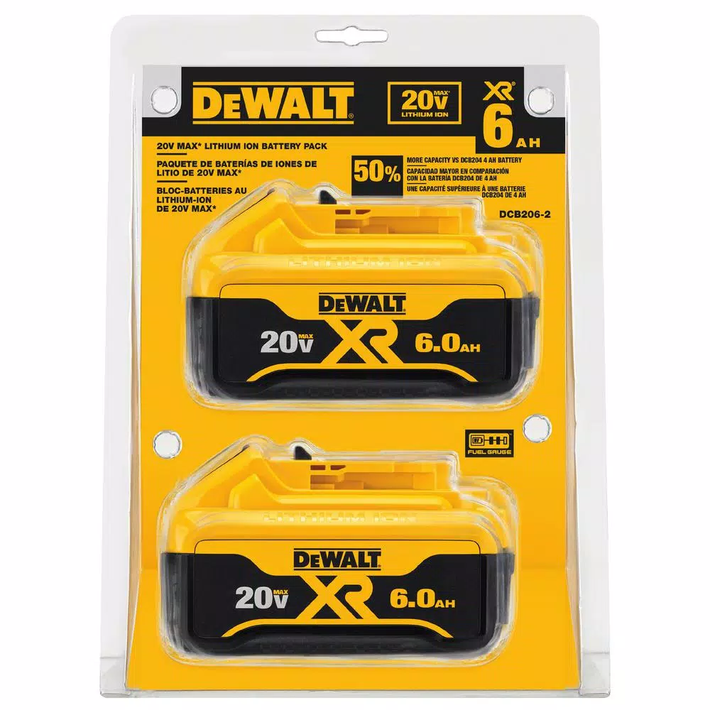 Keep your DEWALT 20-Volt Power Tools running with these high-capacity battery packs. The generous 6.0 Amp-hour capacity allows the user to keep working longer between charging. This DEWALT 20-Volt battery pack is compatible with the 200+ power tools and accessories in the 20-Volt MAX range.