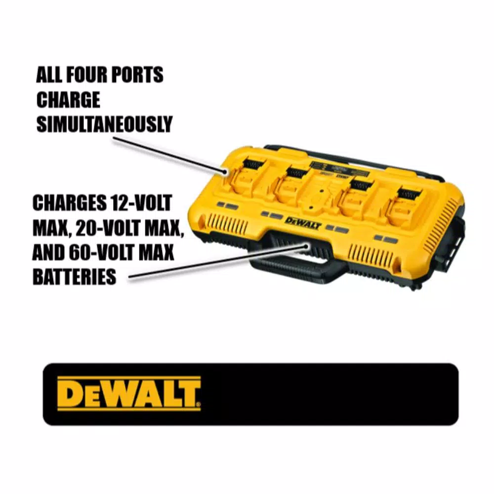 This DEWALT Battery Charger is a 4-port fast charger that charges 12-Volt MAX, 20-Volt MAX, and FLEXVOLT 20-Volt/60-Volt MAX batteries at the same time. This rapid charger quickly charges a 4.0 Ah 20-Volt MAX battery in 40-minutes and a 6.0 Ah 20-Volt MAX battery in 60-minutes. It is also designed to fit our Tool Connect Tag and is Tough System compatible. The DCB104 DEWALT multi-charger also features thru-hole wall mounts so it can be wall mountable in no time at all.