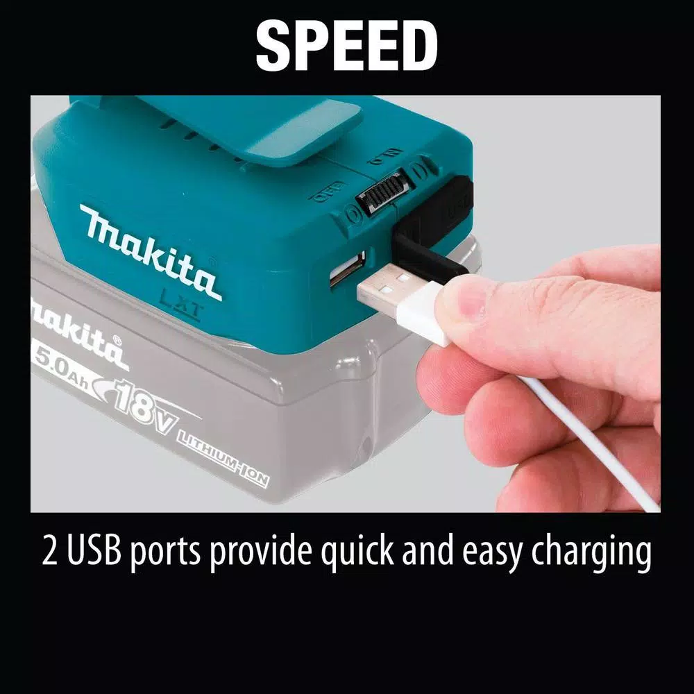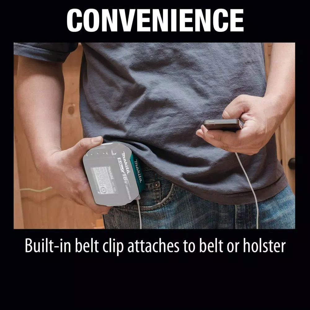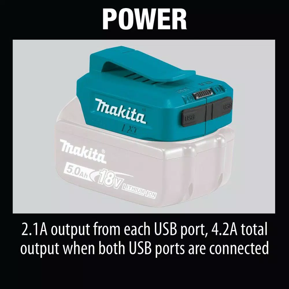Turn your Makita lithium-ion battery into a charging port with the 18-Volt LXT Lithium-ion Cordless Power Source. Mount the ADP05 on to your compatible Makita lithium-ion battery and you get 2 USB charging ports. Each USB port delivers 2.1 Amp output. The built-in clip attaches to a belt or holster, with rubber covers for improved durability.
