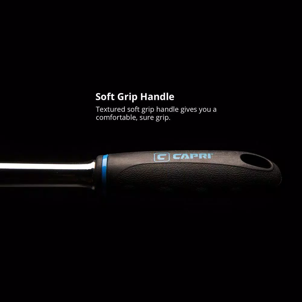 The Capri Tools 3/8 in. Drive 12 in. Breaker Bar with Textured Soft Grip Handle gives you the leverage you need to break loose frozen and stuck nuts and bolts. The textured soft grip handle provides a comfortable sure grip over traditional breaker bar handles. Premium Chrome Vanadium steel body with ultra-strong Chrome Molybdenum head provides extra strength and durability. Spring loaded ball bearing ensures sockets are securely held. The breaker bar head rotates 180° for dynamic utilization in a wide variety of jobs.