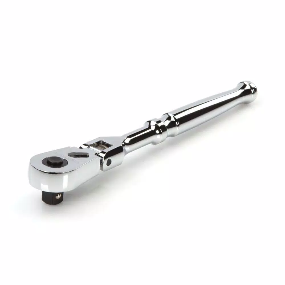 With a 90-tooth gear that produces a working swing arc of just 4°, the TEKTON 3/8 in. Drive x 8 in. Flex Quick-Release Ratchet doesn’t need much room to operate. Its 180°flex head snaps to nine detent positions to work around obstructions. Smaller than low profile, the head is reduced in size in every dimension height, width, and length. Its polished exterior has a chrome plated finish that’s corrosion-resistant and easy to wipe clean.
