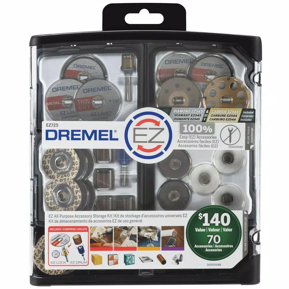 A 100% EZ accessory kit with 70 genuine Dremel accessories that are part of the EZ Lock or Drum system. Offering reusable storage bins and lift-out trays for easy organization of the included bits, this kit is ready for cutting, polishing, sanding, cleaning and more. This EZ kit includes an EZ Lock mandrel, EZ Drum, EZ Lock diamond cutting wheel, EZ Lock carbide cutting wheel, EZ Lock metal cutting wheels, EZ Lock plastic cutting wheels, EZ Lock polishing cloths, EZ Lock sanding discs, EZ Lock sanding buffs, EZ sanding bands and a reusable carrying case with clear lid.