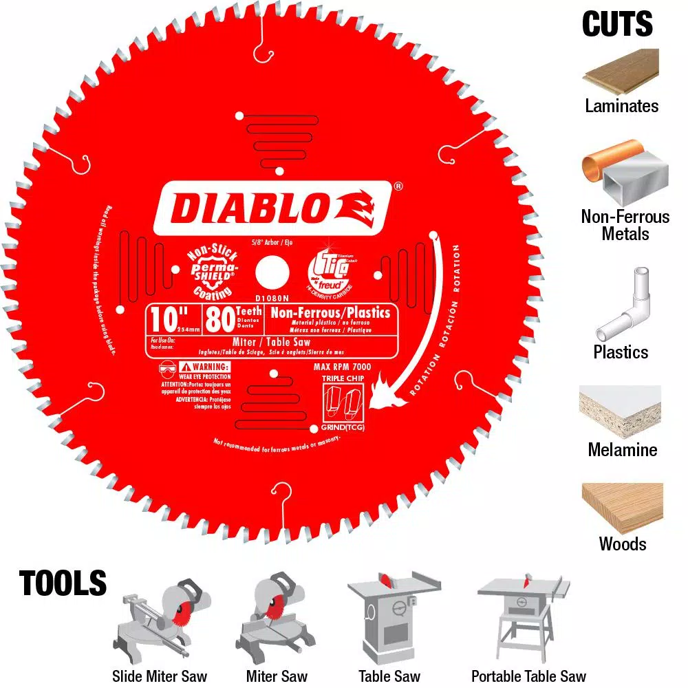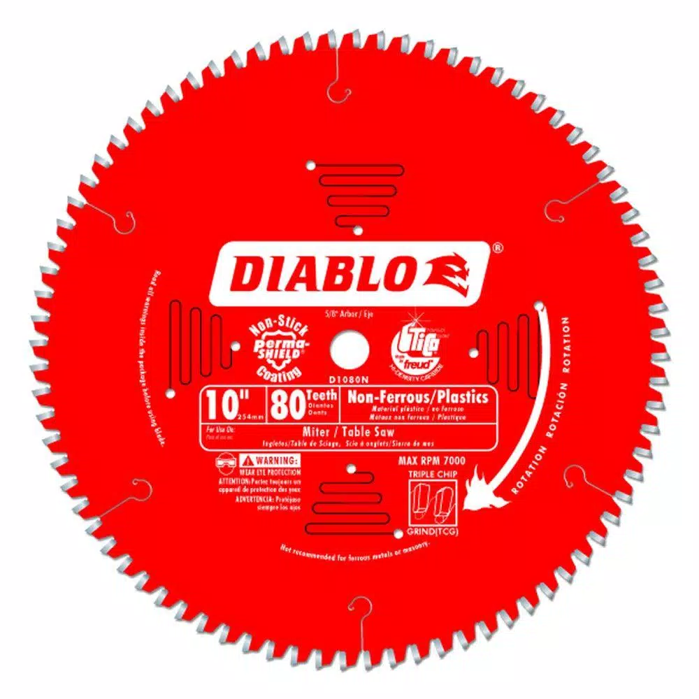Diablo’s next generation 10 in. x 80 Tooth Non-Ferrous/Plastics Carbide Circular Saw Blade features new laser-cut stabilizer vents for precise and clean cuts in non-ferrous metals and plastic materials. The advanced stabilizer vents feature a permanent filler baked in from top to bottom for absorbing noise and preventing sideways movement, allowing the blade to slice through materials cleanly, quickly and accurately. Constructed with TiCo Hi-Density special-blend carbide, Diablo’s 10 in. non-ferrous metals/plastics blade produces precise cuts and provides 5X longer cutting life. The laser cut heat expansion slots allow the blade to expand and contract during use, keeping the cut true and straight. This blade is excellent for cutting plastics, brass, aluminum, copper and fiberglass.