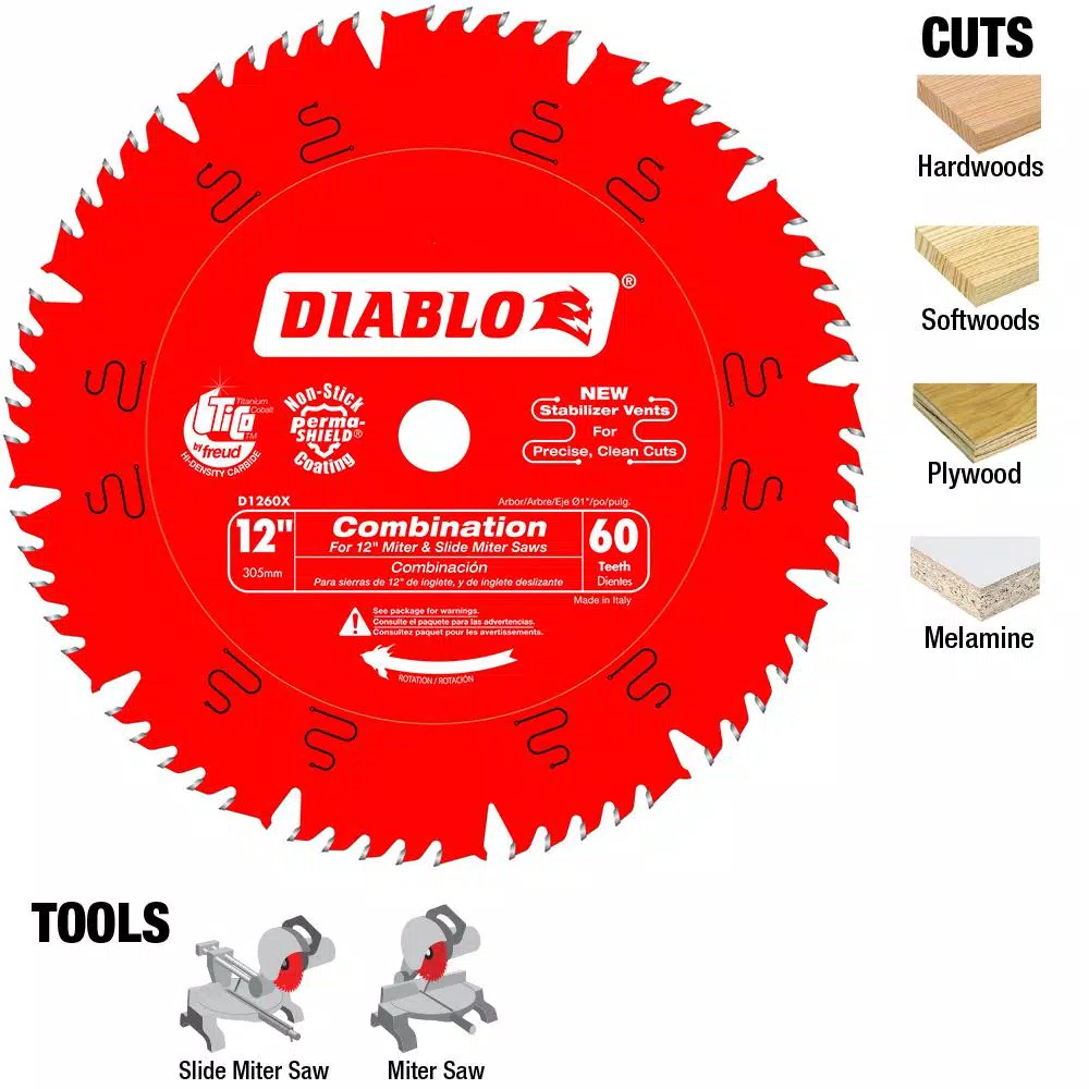 Diablo’s next generation 12 in. x 60 Tooth Combination Carbide Circular Saw Blade features new laser-cut stabilizer vents for precise and clean cuts in a variety of wood materials. The advanced stabilizer vents feature a permanent filler baked in from top to bottom for absorbing noise and preventing sideways movement, allowing the blade to slice through wood cleanly, quickly and accurately. Constructed with TiCo Hi-Density special-blend carbide, Diablo’s 12 in. combination blade produces razor sharp cuts and provides 5X longer cutting life. The laser cut heat expansion slots allow the blade to expand and contract during use, keeping the cut true and straight. This blade is excellent when working on multi-purpose projects such as cabinet work, millwork and furniture construction.