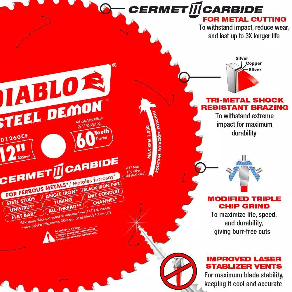 Diablo’s new Steel Demon Cermet blades cut both metal and stainless steel while providing 5x the cutting performance than standard metal cutting blades. By delivering the ultimate metal cutting performance and unmatched value story, this blade is a game changer for metal cutting. This blade features new, exclusive innovation with specially formulated Cermet teeth with a Triple Chip Grind Tooth Design, laser cut blade bodies, anti-vibration technology, and Perma-Shield non-stick coating to deliver precise cuts with no sparks and cool, burr-free edges.