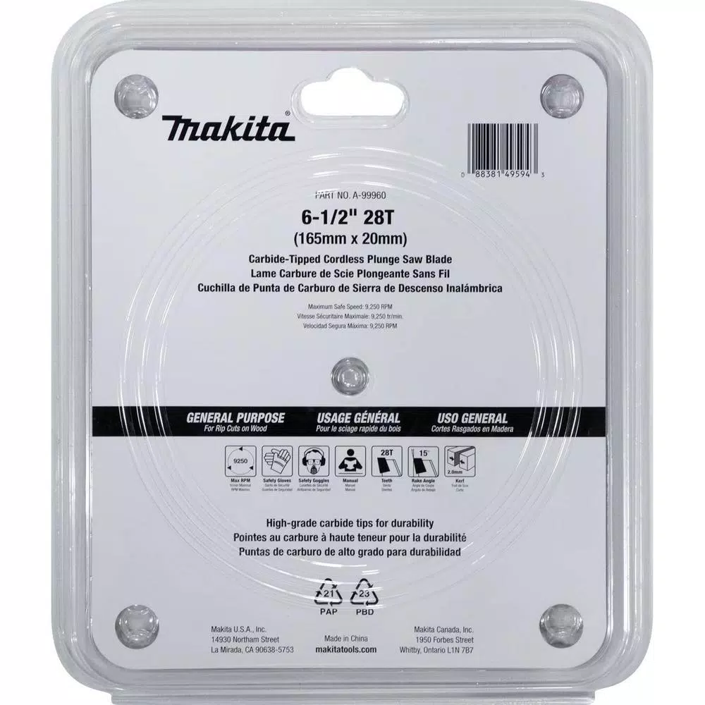 The Makita 28T Carbide-Tipped Saw Blade is the ideal accessory for the Makita 6-1/2 in. Plunge Circular Saw (model XPS01, sold separately). With the XPS01, the A-99960 is an ideal blade rough cutting applications in wood. The Blade features high-grade carbide tips for improved durability, and is engineered for smoother cutting.