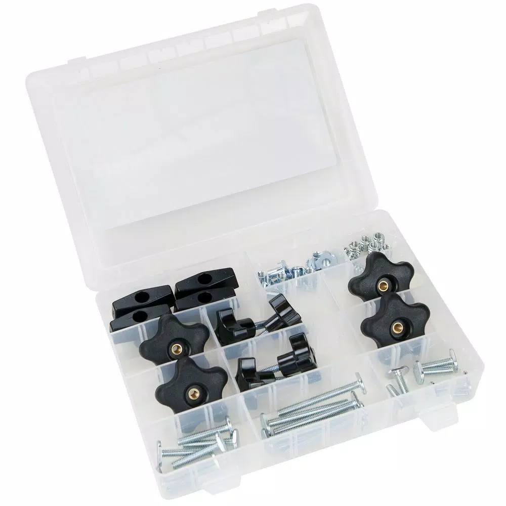 - Includes: six 1 T-bolts, six 1-1/2 in. T-bolts, six 2-1/2 in. T-bolts, four 5-star insert knobs, four 5-star bolt knobs, four 2 in. T-knobs, 8 threaded inserts, 8 T-nuts, 1 storage case