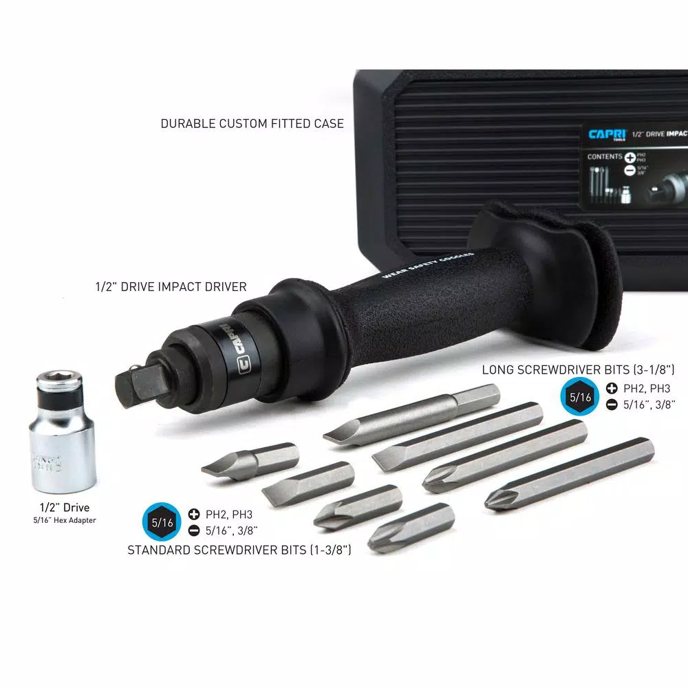 The Capri Tools 1/2 in. Drive Impact Screwdriver Set with Bits helps you turn simple hammer strikes into a powerful and consistent force to securely tighten or quickly loosen stubborn nuts and bolts. It features dual direction: one for tightening and the other for loosening. Simply select the direction to loosen or tighten and use a hammer to strike the impact screwdriver to easily loosen or tighten the fastener. A solid, all steel go-through shaft construction transfers striking force efficiently onto the fastener. Double-layer hand protection protects your hand from hammer strikes. Ergonomic slip-resistant handle is easy to hold securely. It is compatible with 1/2 in. square drive sockets and bits as well as 5/16 in. hex bits by using the included adapter. Set includes the impact screwdriver, an 1/2 to 5/16 in. hex adapter and 8 screwdriver bits: Slotted: 5/16 x 1-3/8, 3/8 x 1-3/8, 5/16 x 3-1/8, 3/8 x 3-1/8 in., Phillips: PH2 x 1-3/8, PH3 x 1-3/8, PH2 x 3-1/8, PH3 x 3-1/8 in. The impact screwdriver is perfect for applications such as replacing brake calipers where fasteners require extra force to loosen and properly tighten.