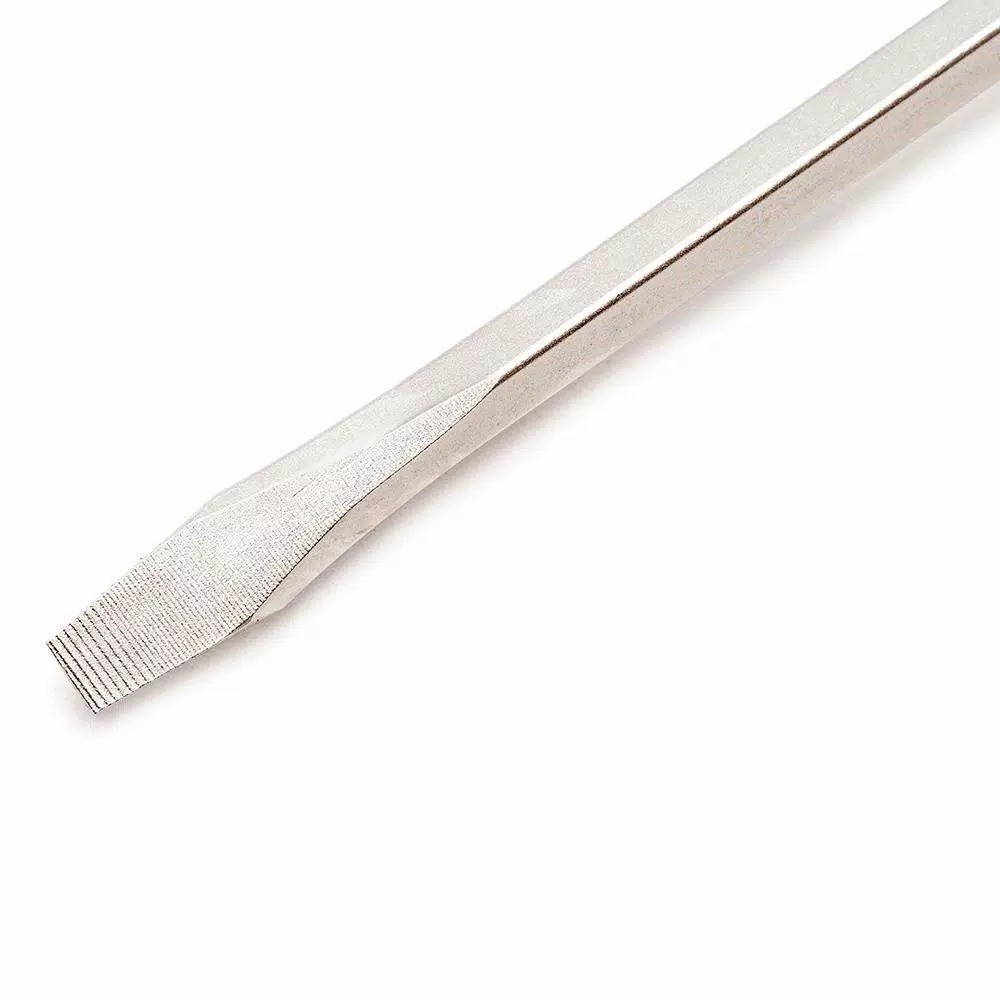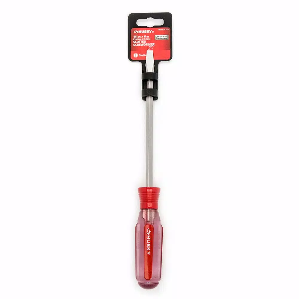 The Husky 1/4 in. x 6 in. Square Shaft Standard Slotted Screwdriver features an impact and chemical resistant acetate handle. The forged steel blade is chrome plated for added corrosion resistance. The slotted tip is serrated which provides increased grip and reduces slipping to better avoid fastener rounding.
