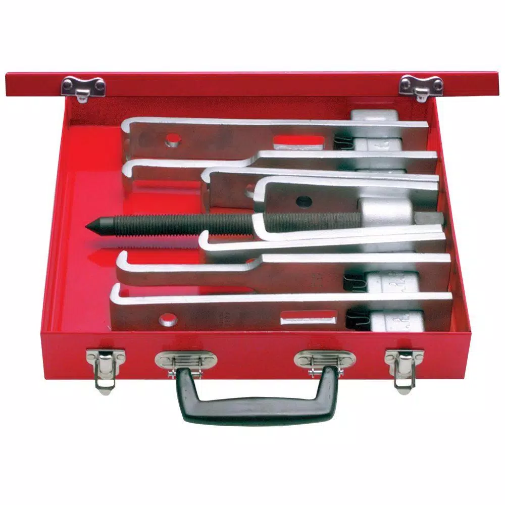 Pullers are tools used for removing items that were inserted under pressure when installed. These straight jaw pullers are commonly used in automotive repair and machinery maintenance. They can be extended using the holes and grooves in each leg. Straight jaw pullers are the most versatile, because it is possible to combine different types of jaws on a crossbar.